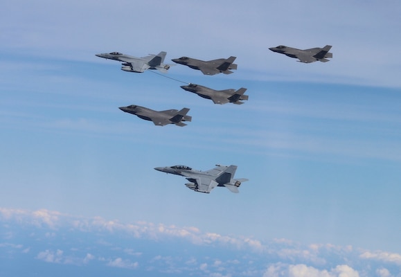 PHLIPPINE SEA - Fifth and 4th generation aircraft assigned to Carl Vinson Carrier Strike Group (VINCSG), with embarked Carrier Air Wing Two (CVW-2), and U.K. Carrier Strike Group (CSG) 21 conducted joint interoperability flights in the U.S. Navy’s 7th Fleet, Aug. 26. During the joint interoperability flights, the aircraft conducted missions to validate joint integration techniques, tactics, and procedures; including mid-air refueling. This is the first time that VINCSG and CSG-21 have operated together. “In a very short amount of time, we were able to seamlessly combine the collective 5th generation capabilities of joint strike fighter aircraft from two services and a partner nation together with the rest of the advanced capabilities of our entire air wing,” said Capt. Tommy Locke, commander, CVW-2. “Our strike group and air wing arrived in the Indo-Pacific ready to demonstrate the value of having agile 5th generation maritime power in the region – and make no doubt, we are ready to win.” Participating aircraft from CVW-2 include: four F-35C Lightning IIs from Strike Fight Squadron (VFA) 147; five F/A-18E/F Super Hornets, assigned to Strike Fighter Squadrons (VFA) 2 and 192; two EA-18G Growlers, from Electronic Attack Squadron (VAQ) 136; and one E-2D Advanced Hawkeye, from Airborne Command and Control Squadron (VAW) 113. Participating CSG-21 aircraft include: two U.S. F-35Bs from Marine Fighter Attack Squadron 211; and two F-35Bs from United Kingdom’s No. 617 Squadron. This was the first training opportunity CSG-21 had to engage with the F-35 “C” model, assigned to CVW-2. The two F-35B squadrons have been deployed together aboard HMS Queen Elizabeth for her inaugural, global deployment, demonstrating the interoperability the F-35 provides. "Integrating United Kingdom and U.S. Marine Corps F-35Bs into a flight with U.S. Navy F-35Cs continues to reinforce the tactical flexibility and interoperability of the F-35," said Col. Simon Doran, U.S. Senior National Representative to the UK CSG. "Additionally, the mission further demonstrates the F-35s ability to support distributed maritime operations." VINCSG provides a combat-ready force to protect and defends the collective maritime interests of the U.S. and its regional allies and partners. Collectively, the VINCSG consists of more than 7,000 Sailors, capable of carrying out a wide variety of missions around the globe. For more news from VINCSG, visit www.dvidshub.net/unit/CSG1