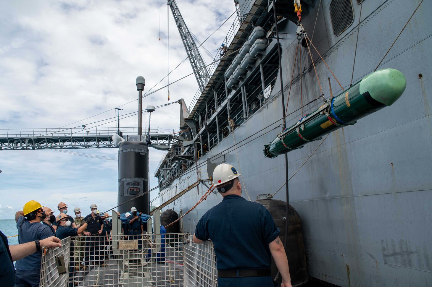 SAIPAN - The submarine tender USS Frank Cable (AS 40) completed a weapons handling exercise involving the transfer of a MK-48 inert training shape to a submarine, Oct. 22. This was the first expeditionary reload Frank Cable has conducted outside of Guam since 2012. Working alongside the Los Angeles-class fast attack submarine USS Hampton (SSN 767), Sailors and civil service mariners with Military Sealift Command (MSC) worked together to complete the exercise safely and efficiently. “This exercise was instrumental to developing the expeditionary combat capabilities that our submarine tenders and submarines bring to the Pacific theater,” said Capt. Albert Alarcon, Frank Cable's commanding officer. “Every training opportunity helps assure our readiness for any contingency.” Sailors first transferred the deck skid to Hampton via crane, where it was attached and assembled on the submarine before transferring the MK-48 inert shape. The crew also had to take into account any rocking of the ship and submarine to ensure the transfer went smoothly. “Due to early and often coordination of this exercise, both Frank Cable and Hampton were able to adapt and safely execute a weapons handling evolution in a new and demanding geographic location,” said Lt. Brandon Shellenberger, Frank Cable’s weapons officer. “The overall execution was great, and everyone demonstrated professionalism and dedication to accomplish the mission." For some, it was their first weapons handling evolution working with two different platforms. Still, the crews worked seamlessly with each other. “Working with Frank Cable's crew of Navy Sailors and MSC civilian mariners is nostalgic for me, as I recall my first deployment as a junior officer on USS Chicago and mooring outboard Frank Cable in Hong Kong,” said Cmdr. Phillip Sylvia, Jr., Hampton’s commanding officer. “Now in command during my second deployment, Frank Cable continues to provide excellent support for my crew ranging from ordnance, as demonstrated today, to mailing a letter home from their post office. They do it all to support the warfighter.” The evolution was lengthy. For some, they were able to bring their submarine expertise to an exercise that many Frank Cable Sailors and civil service mariners had yet to experience in their careers. “This MSC team onboard Frank Cable has always been able to work effortlessly with any Navy detachment to accomplish any goal we are tasked with,” said Torpedoman's Mate 1st Class Robert Hollister, Frank Cable’s W-1 division leading petty officer. “Hampton’s weapons department was a very professional and efficient handling team,” Hollister said of working with the submarine Sailors. “My team and I would be glad to work with them again.” Both crews followed all fleet-mandated COVID protocols with no impact to the exercise. Frank Cable, forward-deployed to the island of Guam, repairs, rearms, and reprovisions submarines and surface vessels in the Indo-Pacific region. Frank Cable is on patrol conducting expeditionary maintenance and logistics in support of national security in the U.S. 7th Fleet area of operations. Under Commander, U.S. Pacific Fleet, 7th Fleet is the U.S. Navy's largest forward-deployed numbered fleet, and routinely interacts and operates with 35 maritime nations in preserving a free and open Indo-Pacific region.