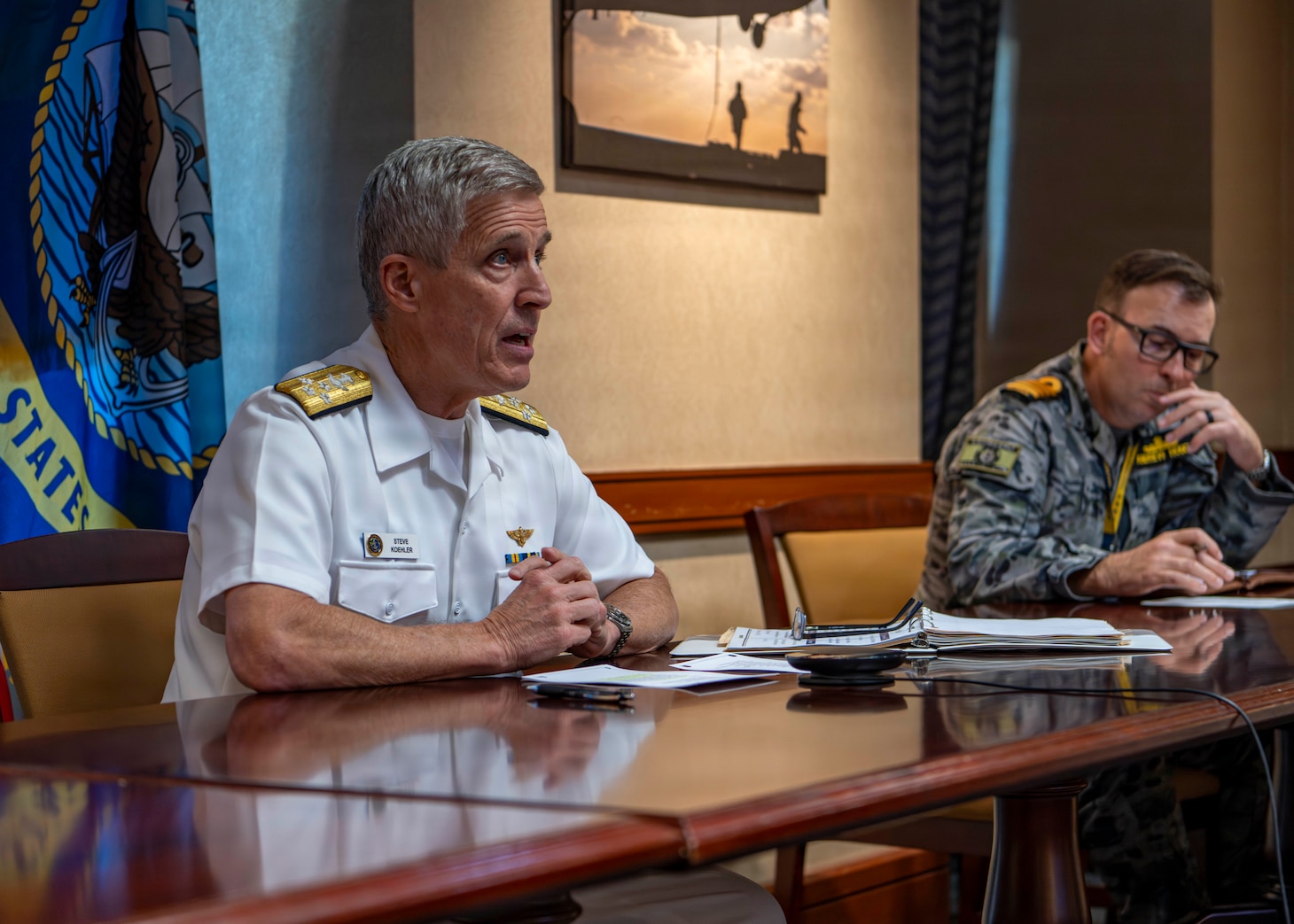 Adm. Steve Koehler, commander, U.S. Pacific Fleet, left, hosts a virtual key leader engagement with partners from 18 navies, Dec. 2, 2025. The leaders discussed building resilient maritime supply chains in the Indo-Pacific and recognizing the region’s critical role as the backbone for global trade, energy, and security.. The multinational maritime engagement program underscores Pacific Fleet’s commitment to strengthening alliances and partnerships while maintaining a free and open Indo-Pacific. (U.S. Navy photo by Mass Communication Specialist 2nd Class Jeremy R. Boan)