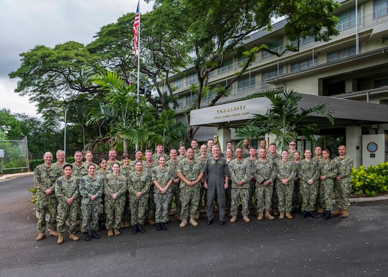 Sailors assigned to the Commander, U.S. Pacific Fleet (COMPACFLT) reserve public affairs unit pose for a photo with Adm. Steve Koehler, center, (COMPACFLT) at a reserve public affairs summit on Joint Base Pearl Harbor-Hickam, Hawaii, Feb. 5-8, 2026. (U.S. Navy photo by Mass Communication Specialist 2nd Class Jeremy Boan).