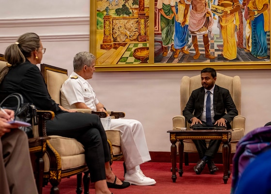 Adm. Steve Koehler, commander, U.S. Pacific Fleet, and U.S. Charge d'Affaires to Sri Lanka Jayne Howell, left, meet with the Honorable Arun Hemachandra, Sri Lanka Deputy Minister of Foreign Affairs, during Koehler’s visit to Colombo, Sri Lanka, Feb. 20, 2026. The visit to Sri Lanka reaffirmed the U.S. commitment to building strong partnerships that advance a free, open, and prosperous Indo-Pacific. (U.S. Navy photo by Mass Communication Specialist 2nd Class Jeremy R. Boan)