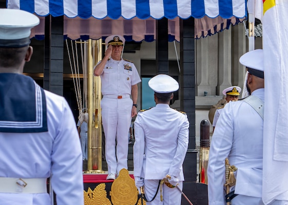 Adm. Steve Koehler, commander, U.S. Pacific Fleet, salutes the sideboys during his arrival to Colombo, Sri Lanka, Feb. 19, 2026. The visit to Sri Lanka reaffirmed the U.S. commitment to building strong partnerships that advance a free, open, and prosperous Indo-Pacific. (U.S. Navy photo by Mass Communication Specialist 2nd Class Jeremy R. Boan)