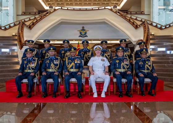 Adm. Steve Koehler, commander, U.S. Pacific Fleet, poses for a photo with Air Marshal Bandu Edirisinghe, commander of the Sri Lanka Air Force, and his staff during his visit to the Sri Lanka Air Force Headquarters in Colombo, Sri Lanka, Feb. 20, 2026. The visit to Sri Lanka reaffirmed the U.S. commitment to building strong partnerships that advance a free, open, and prosperous Indo-Pacific. (U.S. Navy photo by Mass Communication Specialist 2nd Class Jeremy R. Boan)