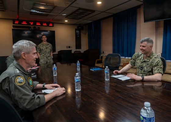 Adm. Steve Koehler, commander, U.S. Pacific Fleet, left, meets with Rear Adm. Ian Johnson, commander, U.S. Naval Forces Japan (CNFJ), at the CNFJ headquarters on Commander, Fleet Activities Yokosuka, Japan, April 13, 2026. The visit to Japan underscored the United States’ commitment to peace and stability in the region, committed to enhancing resiliency and interoperability between U.S. and Japanese forces, and other regional allies and partners. (U.S. Navy photo by Mass Communication Specialist 2nd Class Christopher Sypert)