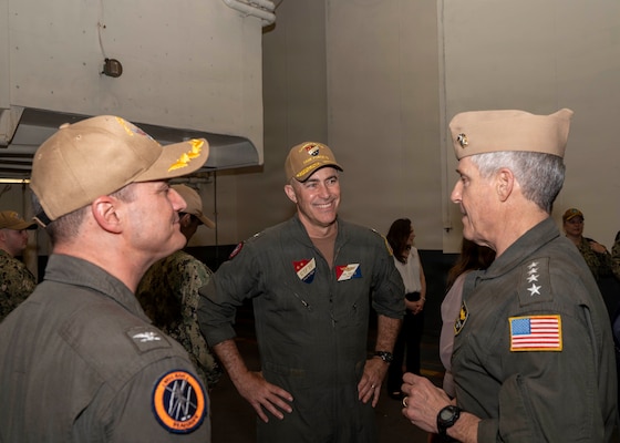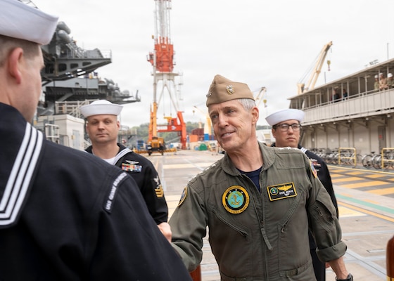 Adm. Steve Koehler, commander, U.S. Pacific Fleet, right, is greeted by Rear Adm. Eric Anduze, commander, Carrier Strike Group 5 and commander, Task Force 70, center, and Capt. Nicholas DeLeo, commanding officer, USS George Washington (CVN 73), during his arrival to Nimitz-class aircraft carrier USS George Washington (CVN 73) while the ship is moored on Commander, Fleet Activities Yokosuka, Japan, April 13, 2026. The visit to Japan underscored the United States’ commitment to peace and stability in the region, committed to enhancing resiliency and interoperability between U.S. and Japanese forces, and other regional allies and partners. (U.S. Navy photo by Mass Communication Specialist 2nd Class Christopher Sypert)