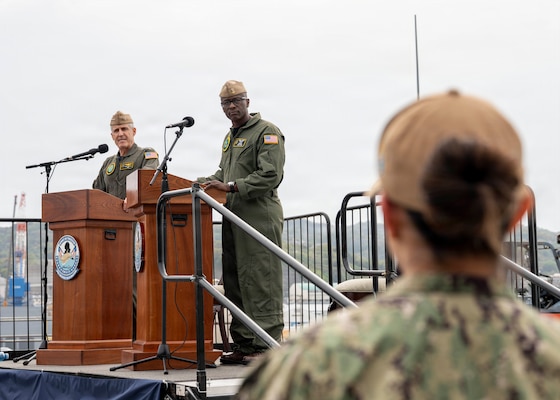 Adm. Steve Koehler, commander, U.S. Pacific Fleet, left, and U.S. Pacific Fleet Master Chief Don Davis speak to Sailors about Koehler’s Fleet Orders during an all-hands call on the flight deck of Nimitz-class aircraft carrier USS George Washington (CVN 73) while the ship is moored on Commander, Fleet Activities Yokosuka, Japan, April 13, 2026. The visit to Japan underscored the United States’ commitment to peace and stability in the region, committed to enhancing resiliency and interoperability between U.S. and Japanese forces, and other regional allies and partners. (U.S. Navy photo by Mass Communication Specialist 2nd Class Christopher Sypert)