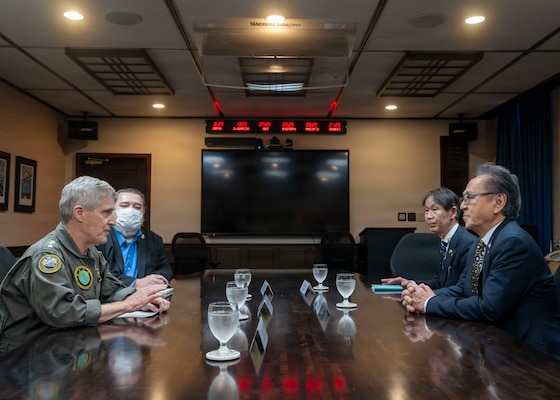 Adm. Steve Koehler, commander, U.S. Pacific Fleet, right, and Rear Adm. Ian Johnson, commander, U.S. Naval Forces Japan (CNFJ), left, meet with the City of Yokosuka Mayor, Katsuaki Kamijii, at the USFJ headquarters on Commander, Fleet Activities Yokosuka, Japan, April 13, 2026. The visit to Japan underscored the United States’ commitment to peace and stability in the region, committed to enhancing resiliency and interoperability between U.S. and Japanese forces, and other regional allies and partners. (U.S. Navy photo by Mass Communication Specialist 2nd Class Christopher Sypert)