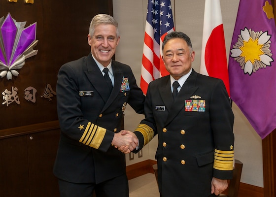 Adm. Steve Koehler, commander, U.S. Pacific Fleet, right, meets with Adm. Akira Saito, chief of staff, Japan Maritime Self-Defense Force, in Tokyo, April 14, 2026. The visit to Japan underscored the United States’ commitment to peace and stability in the region, committed to enhancing resiliency and interoperability between U.S. and Japanese forces, and other regional allies and partners. (U.S. Navy photo by Mass Communication Specialist 2nd Class Christopher Sypert)
