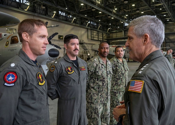 Adm. Steve Koehler, commander, U.S. Pacific Fleet, right, speaks to Sailors assigned to Carrier Air Wing (CVW) 5 during a tour of Marine Corps Air Station Iwakuni, Japan, April 15, 2026. The visit to Japan underscored the United States’ commitment to peace and stability in the region, committed to enhancing resiliency and interoperability between U.S. and Japanese forces, and other regional allies and partners. (U.S. Navy photo by Mass Communication Specialist 2nd Class Christopher Sypert)