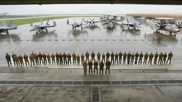Front row from left to right: Command Master Chief Ry Vansickle, Carrier Air Wing (CVW) 5, Capt. Daniel O’Hara, deputy commander, CVW 5, Adm. Steve Koehler, commander, U.S. Pacific Fleet (COMPACFLT), COMPACFLT Master Chief Don Davis, Capt. Brian Kesselring, commander, CVW 5, and Sailors pose for a photo during a tour of Marine Corps Air Station Iwakuni, Japan, April 15, 2026. The visit to Japan underscored the United States’ commitment to peace and stability in the region, committed to enhancing resiliency and interoperability between U.S. and Japanese forces, and other regional allies and partners. (U.S. Navy photo by Mass Communication Specialist 2nd Class Christopher Sypert)
