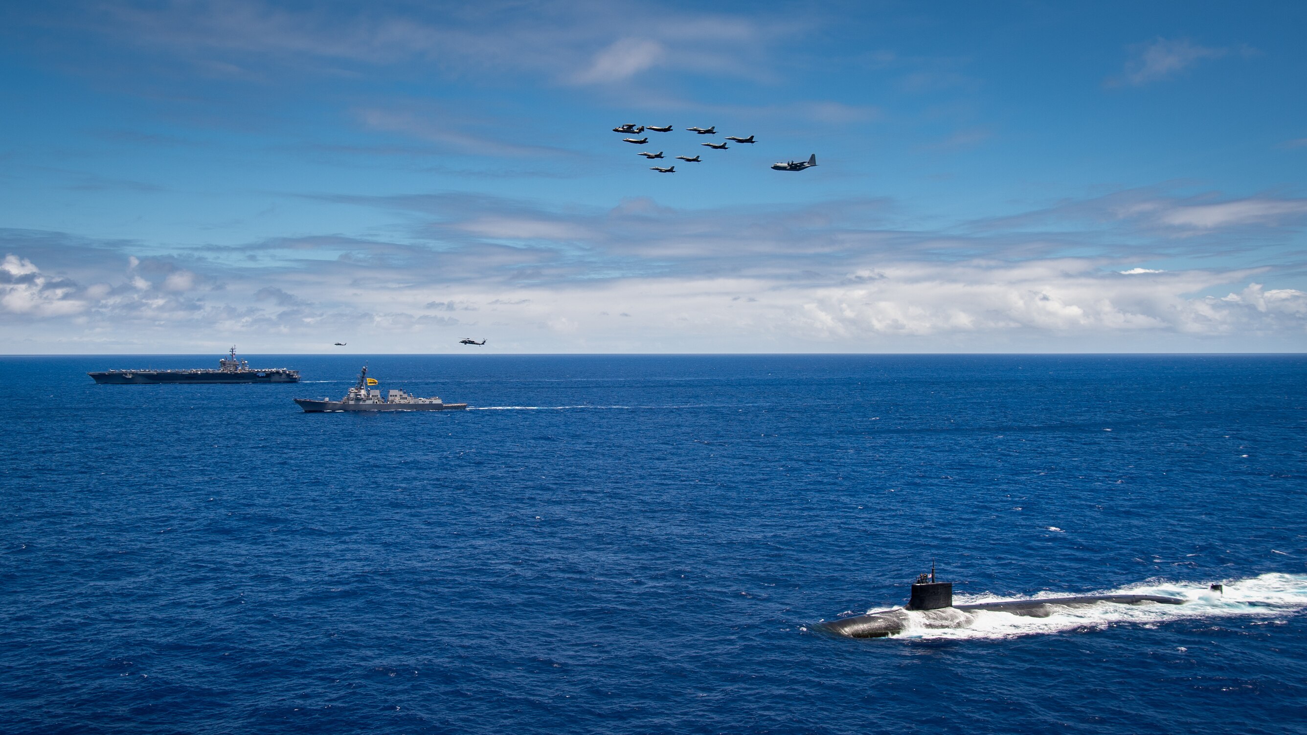 USS Carl Vinson (CVN 70), USS Dewey (DDG 105) and USS Seawolf (SSN 21) sail in formation as Marine Corps aircraft fly overhead, June 22. (U.S. Navy/MC3 Haydn Smith)