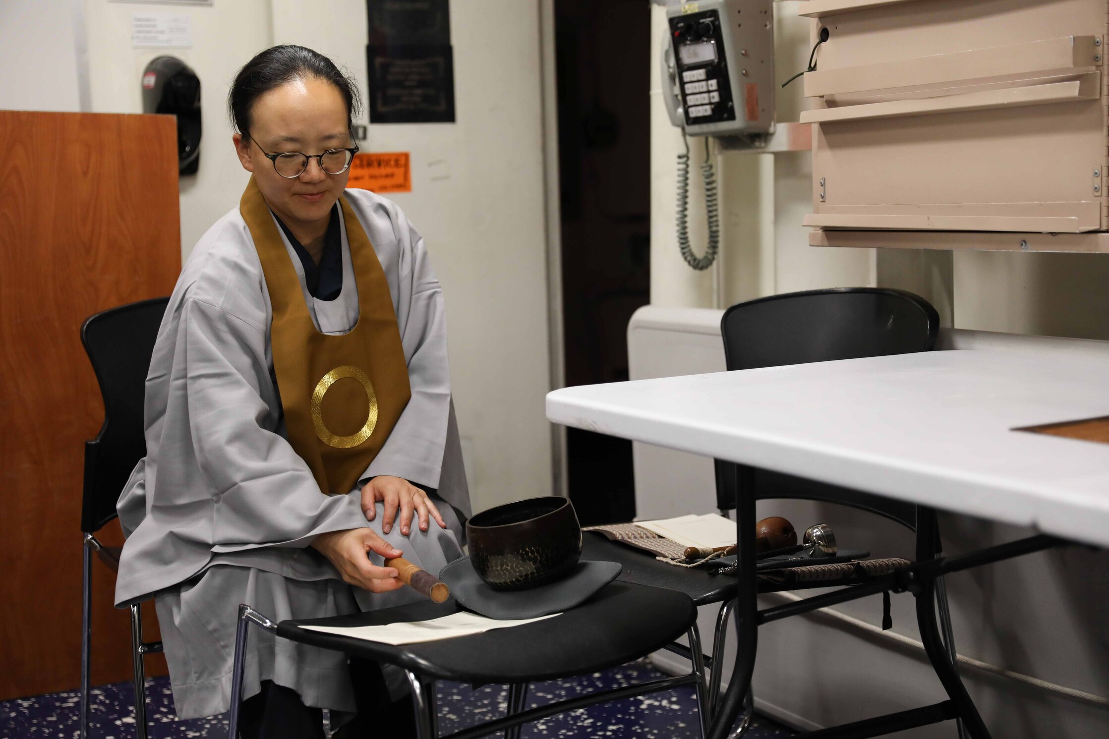 ATLANTIC OCEAN (Sept. 11, 2022) U.S. Navy Chaplain Lt. Saejeong Kim performs a Buddhist Dharma service onboard the guided-missile destroyer USS McFaul (DDG 74), Sept. 11. Kim was commissioned as a Navy Chaplain in 2017 and currently serves with Destroyer Squadron 2 as the only active-duty Buddhist chaplain in the U.S. Navy. (U.S. Navy photo by Mass Communication Specialist 3rd Class Kerri Kline)