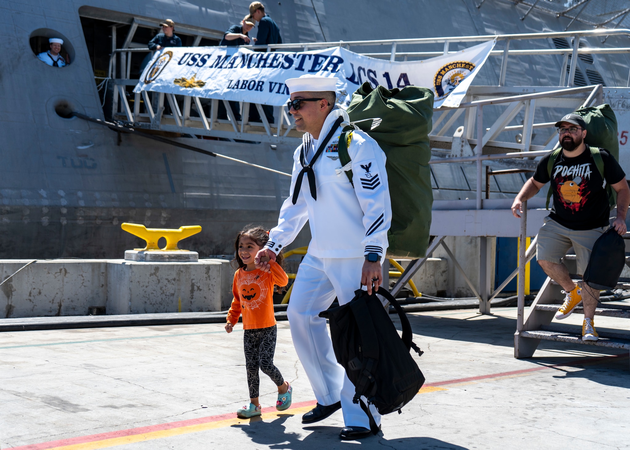 OS1 Dominick Torres greets a loved one during a homecoming ceremony for USS Manchester (LCS 14) at Naval Base San Diego. (MC2 Isaak Martinez)