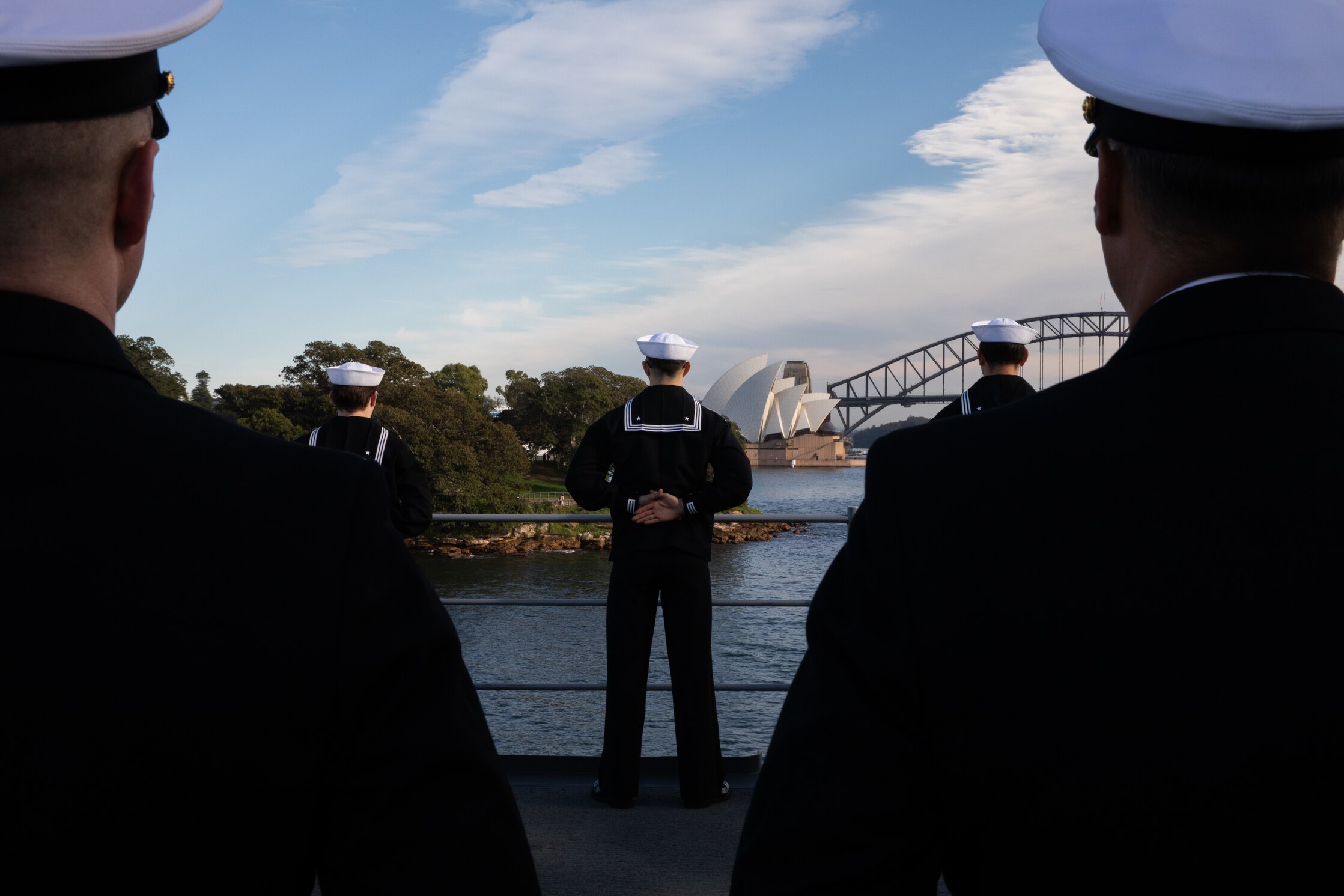 SYDNEY, Australia (May 26, 2025) - Sailors assigned to the U.S. 7th Fleet flagship USS Blue Ridge (LCC 19) and 7th Fleet Staff man the rails while pulling into Sydney, Australia for a scheduled port visit, May 26, 2025. 7th Fleet is the U.S. Navy's largest forward-deployed numbered fleet, and routinely interacts and operates with allies and partners in preserving a free and open Indo-Pacific region. (U.S. Navy photo by Lt.j.g. Sarah Merrill)