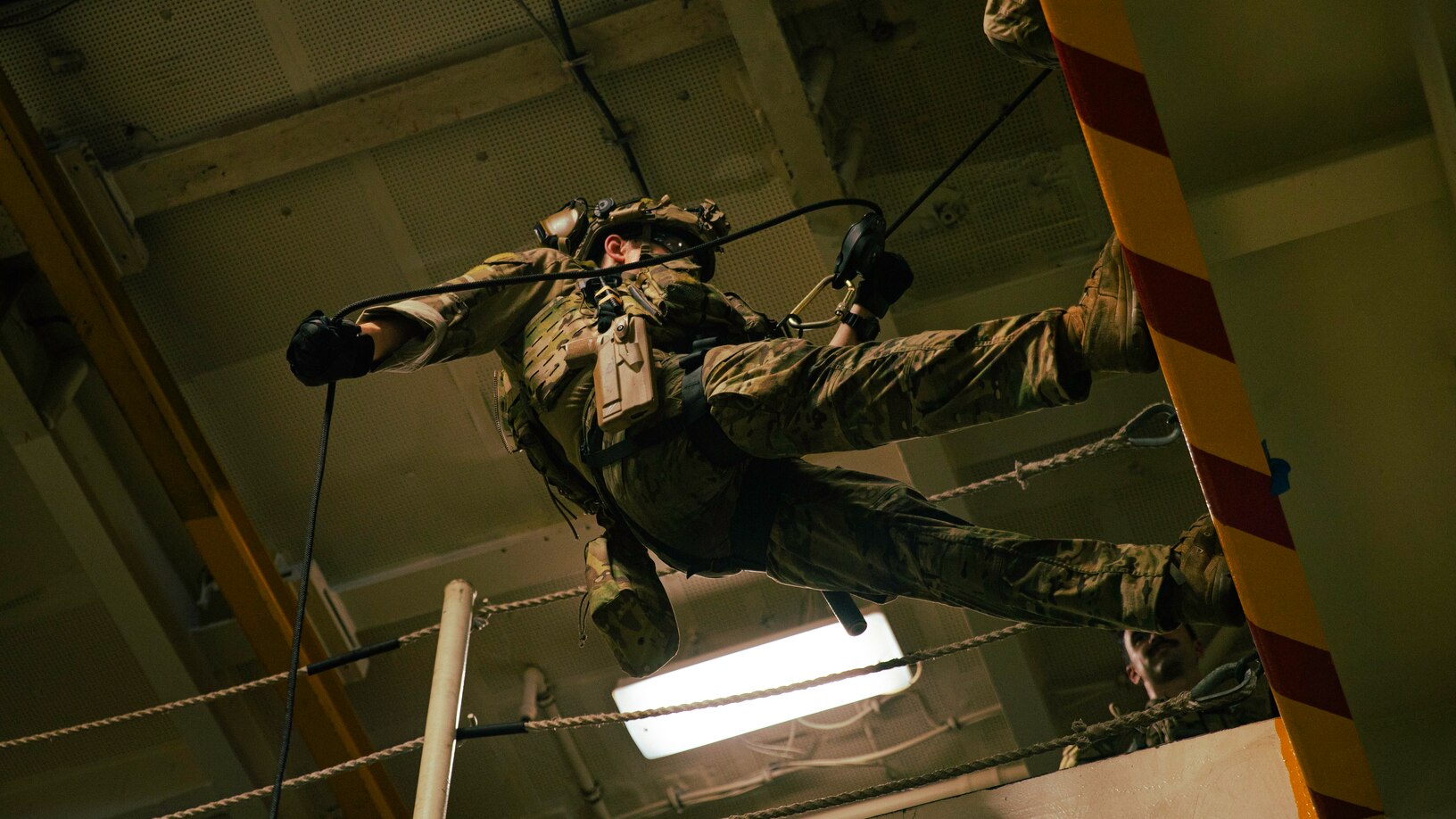 A Sailor, assigned to Explosive Ordnance Disposal Mobile Unit (EODMU) 5, attached to Commander, Task Force (CTF) 70, rappels in the hangar bay of the Nimitz-class aircraft carrier USS George Washington (CVN 73) while operating in the Philippine Sea, Aug. 6, 2025. The George Washington is the U.S. Navy’s premier forward-deployed aircraft carrier, a long-standing symbol of the United States’ commitment to maintaining a free and open Indo-Pacific region, while operating alongside allies and partners across the U.S. Navy (U.S. Navy photo by Mass Communication Specialist 2nd Class Kaleb C. Birch)