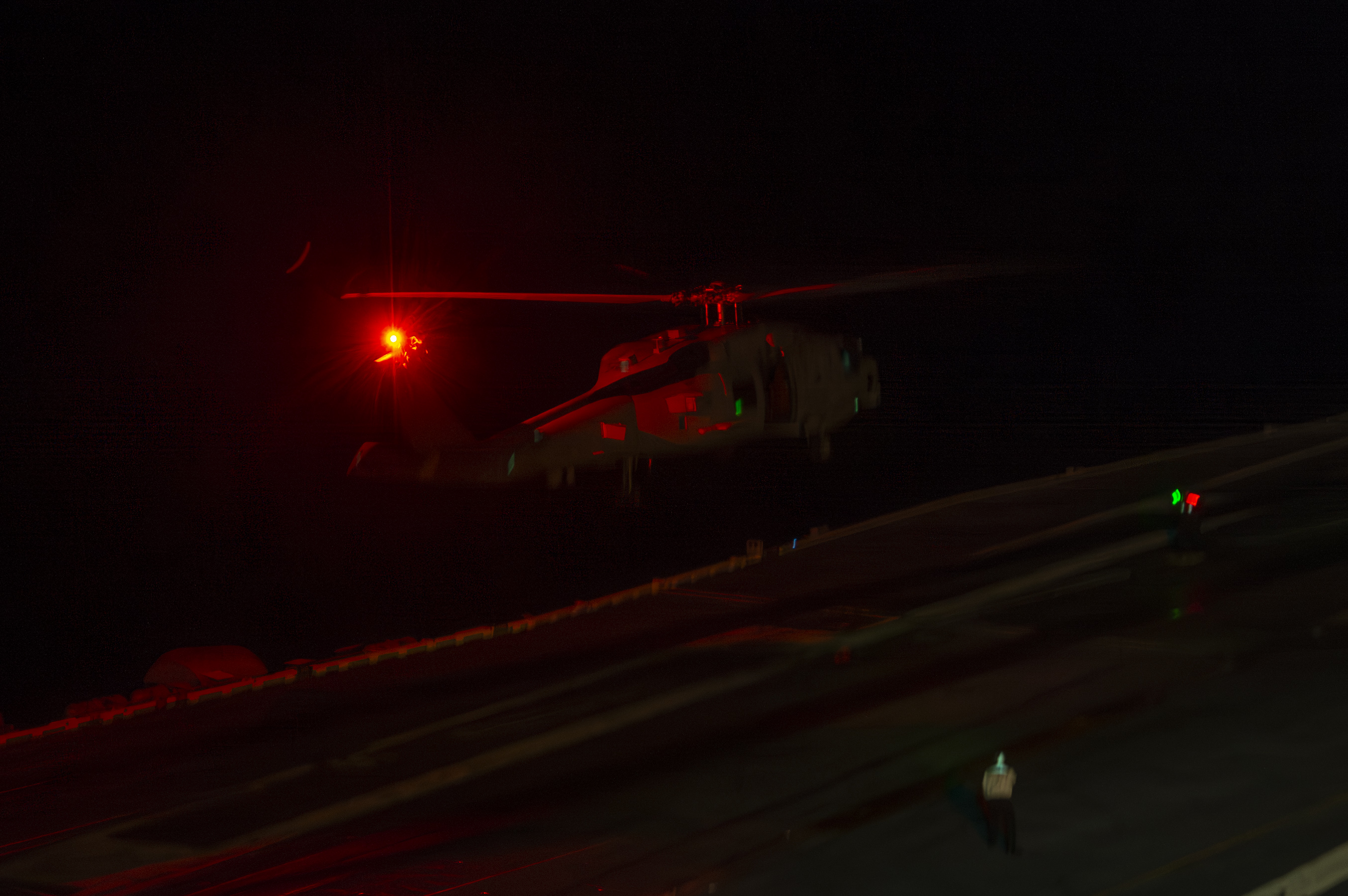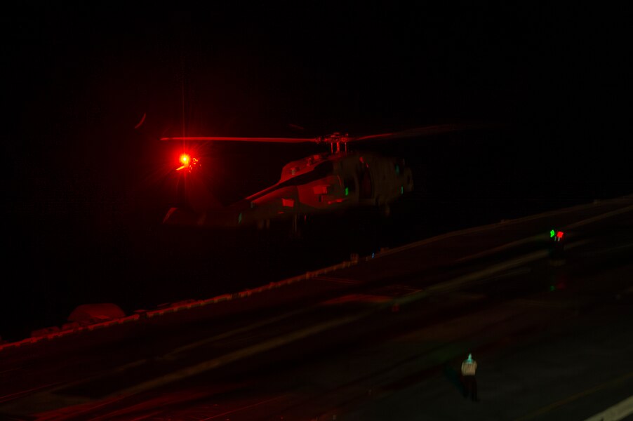 250814-N-BE753-1138 PACIFIC OCEAN (Aug. 14, 2025) An MH-60R Sea Hawk helicopter, attached to Helicopter Maritime Strike Squadron (HSM) 71, prepares to land on the flight deck of the Nimitz-class aircraft carrier USS Abraham Lincoln (CVN 72). Abraham Lincoln, flagship of Carrier Strike Group Three, is underway conducting routine training operations in the U.S. 3rd Fleet area of operations. As an integral part of U.S. Pacific Fleet, Commander, U.S. 3rd Fleet operates naval forces in the Indo-Pacific and provides the realistic and relevant training to ensure the readiness necessary to execute the U.S. Navy’s timeless role across the full spectrum of military operations. (U.S. Navy photo by Mass Communication Specialist Seaman Glory Anderson)