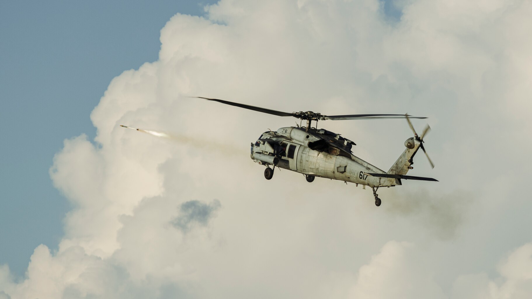 An MH-60S Seahawk, attached to Helicopter Sea Combat Squadron (HSC) 12, fires an LAU-61 G/A digital rocket launcher during a live-fire exercise with the Nimitz-class aircraft carrier USS George Washington (CVN 73) while underway in the Pacific Ocean, Aug. 26, 2025. The George Washington is the U.S. Navy’s premier forward-deployed aircraft carrier, a long-standing symbol of the United States’ commitment to maintaining a free and open Indo-Pacific region, while operating alongside allies and partners across the U.S. Navy’s largest numbered fleet. (U.S. Navy photo by Mass Communication Specialist 3rd Class Geoffrey L. Ottinger)