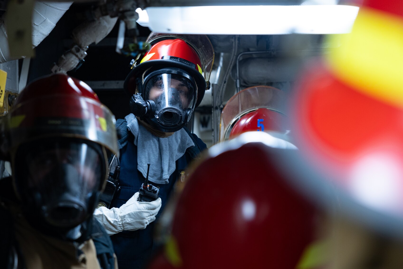 PACIFIC OCEAN (Aug. 23, 2025) - Damage Controlman 2nd Class Isiah Roberts, from Pine Hills, Florida, center, assumes the role as scene leader aboard the Arleigh Burke-class guided-missile destroyer USS Curtis Wilbur (DDG 54) during an integrated training team general quarters drill in the Pacific Ocean, Aug. 23. The Curtis Wilbur is underway in the Pacific Ocean conducting routine operations. The U.S. Navy conducts exercises and operations to maintain readiness, refine tactics, deter conflict, and support maritime homeland defense. The Curtis Wilbur is forward deployed and currently assigned to Destroyer Squadron (DESRON) 15, the Navy’s largest DESRON and the U.S. 7th Fleet’s principal surface force. (U.S. Navy photo by Mass Communication Specialist Seaman Mark Bergado)