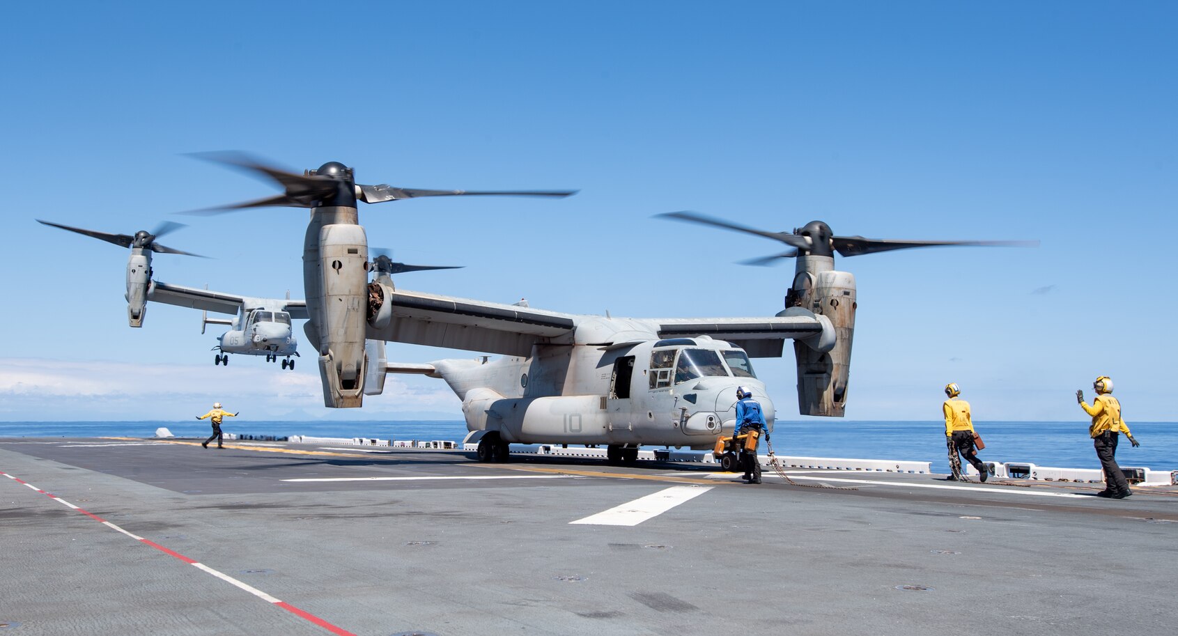 PACIFIC OCEAN (Sept. 7, 2025) Sailors assigned to the amphibious assault ship USS America (LHA 6) chock and chain a U.S. Marine Corps MV-22B Osprey, assigned to Medium Tiltrotor Squadron (VMM) 268, while conducting flight operations in the Pacific Ocean, Sept. 7. The America is operating in the U.S. 3rd Fleet area of operations. An integral part of the U.S. Pacific Fleet, U.S. 3rd Fleet leads naval forces in the Indo-Pacific and provides the realistic, relevant training necessary to execute the U.S. Navy’s role across the full spectrum of military operations. U.S. 3rd Fleet works together with allies and partners to advance freedom of navigation and overflight, the rule of law and other principles that underpin security for the Indo-Pacific region. (U.S. Navy photo by Mass Communication Specialist 3rd Class Kenneth Melseth)