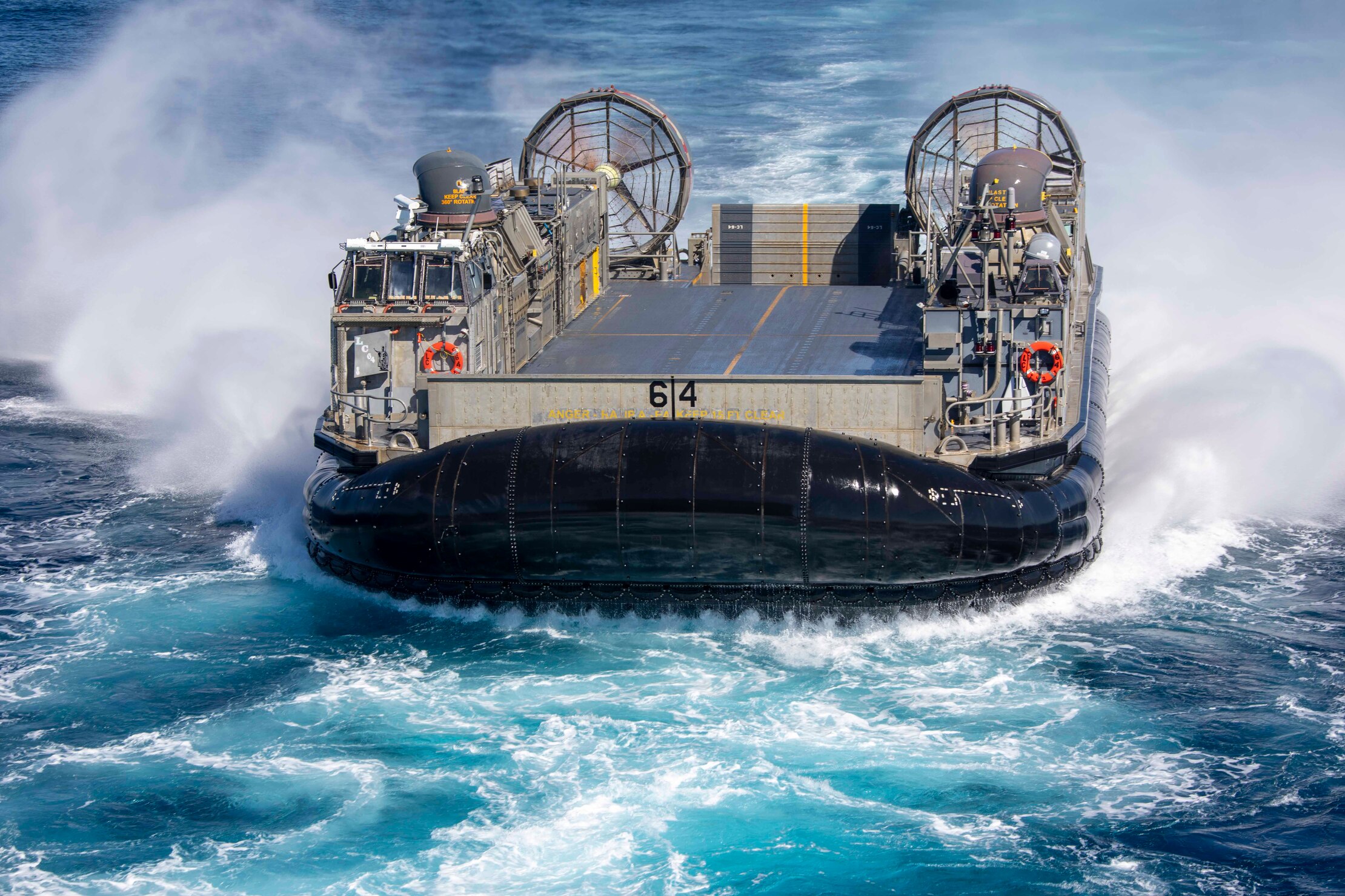 Landing Craft, Air Cushion 64, assigned to Assault Craft Unit 5, prepares to enter the well deck of the Wasp-class amphibious ship USS Makin Island (LHD 8), Sept. 9, 2025. The Makin Island is currently underway conducting routine operations in the U.S. 3rd Fleet. (U.S. Navy photo by Mass Communication Specialist Seaman Abraham Ramirez)
