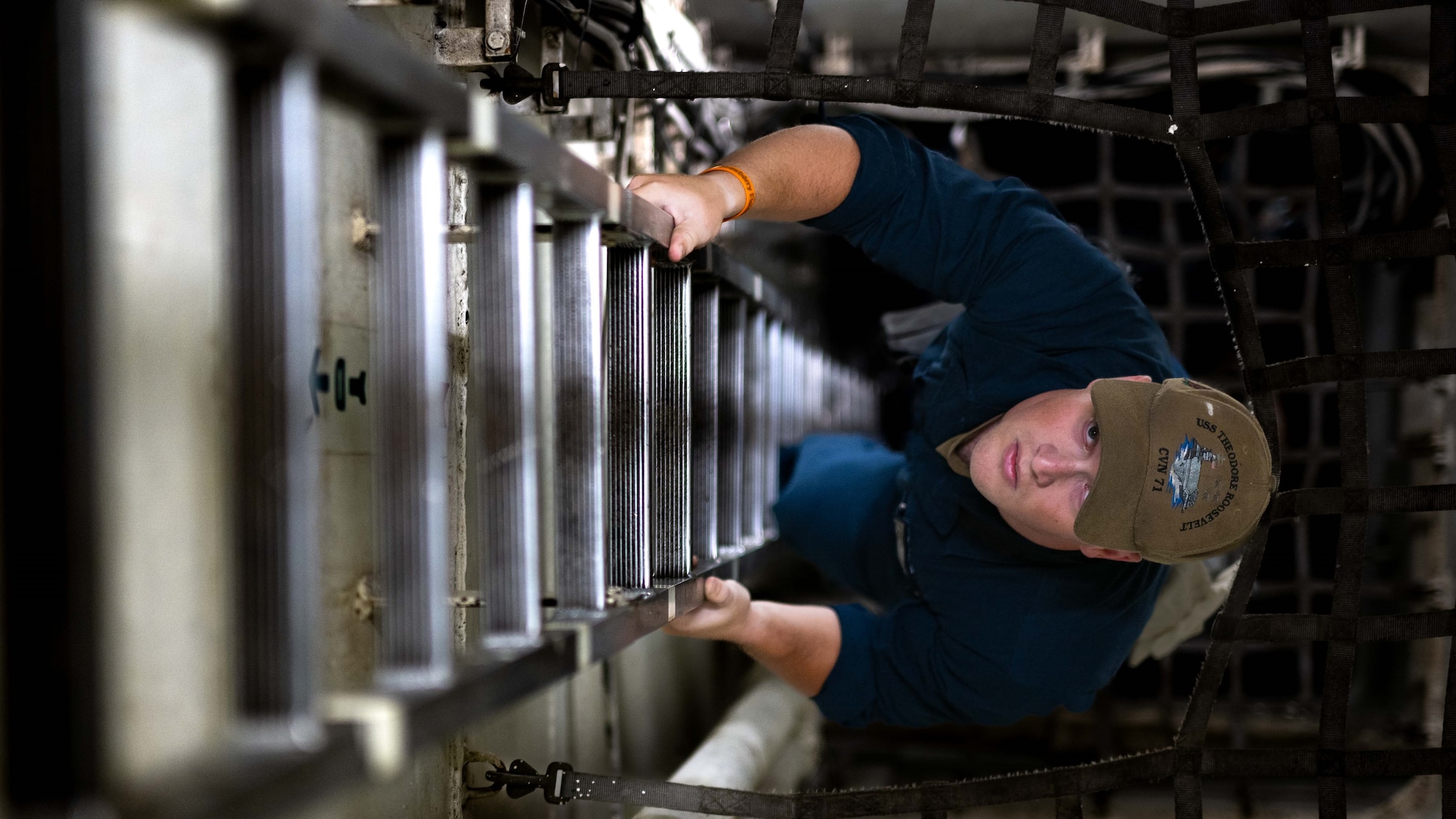 PACIFIC OCEAN (Sept. 13, 2025) – U.S. Navy Engineman Fireman Ian Miller, from Virginia Beach, Va., climbs out of an engineering space aboard the Nimitz-class aircraft carrier USS Theodore Roosevelt (CVN 71), Sept. 13. The Theodore Roosevelt, flagship of Carrier Strike Group (CSG) 9, is underway conducting exercises to bolster strike group readiness and capability in the U.S. 3rd Fleet area of operations. (U.S. Navy photo by Mass Communication Specialist 3rd Class Aaron Haro Gonzalez)