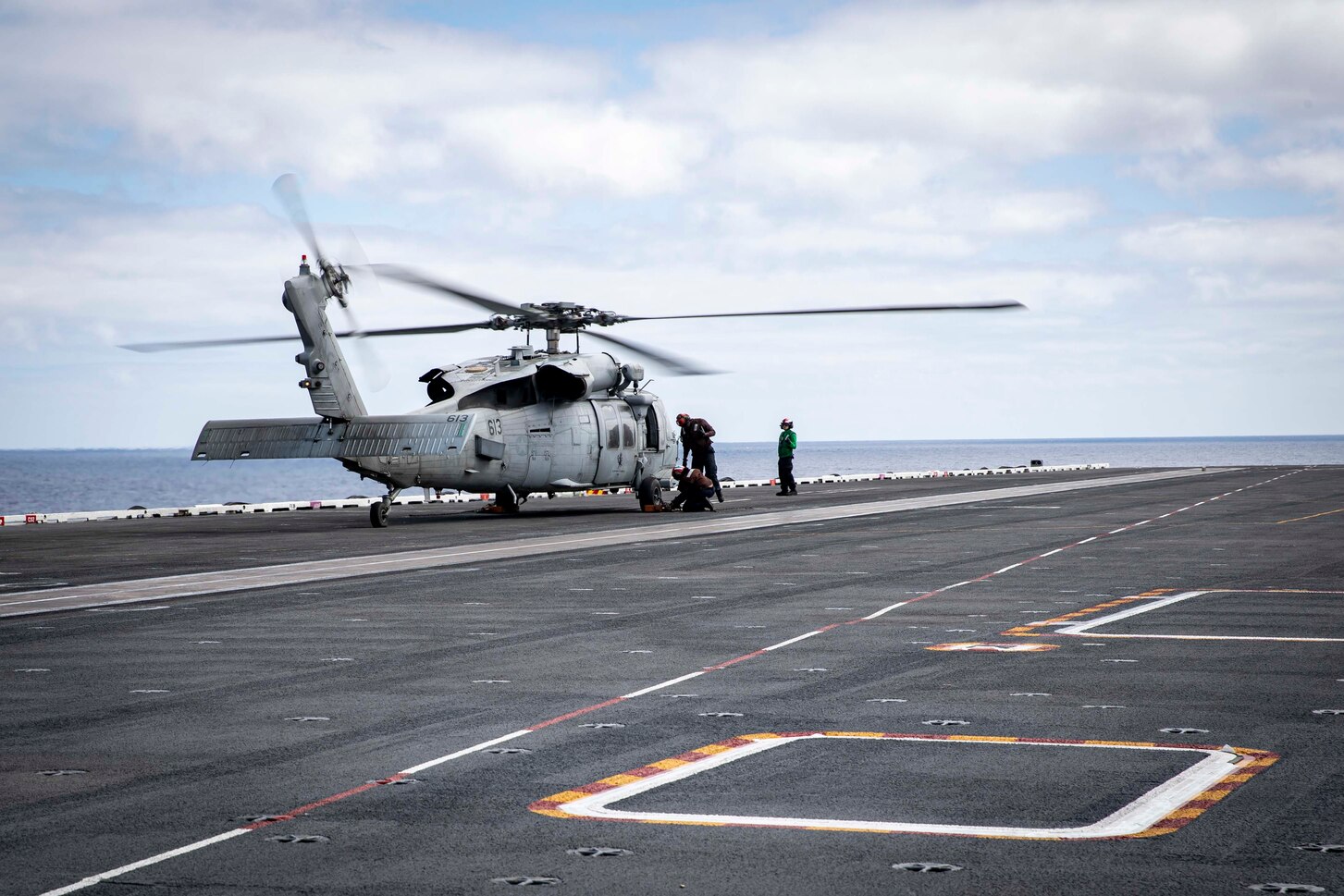 PACIFIC OCEAN (Sep. 12, 2025) Sailors chock and chain an MH-60S Sea Hawk, attached to Helicopter Sea Combat Squadron (HSC) 14, on the flight deck of Nimitz-class aircraft carrier USS Abraham Lincoln (CVN 72). Abraham Lincoln, flagship of Carrier Strike Group 3, is underway conducting routine training operations in the U.S. 3rd Fleet area of operations, as an integral part of U.S. Pacific Fleet, Commander, U.S. 3rd Fleet operates naval forces in the Indo-Pacific and provides the realistic and relevant training to ensure the readiness necessary to execute the U.S. Navy’s timeless role across the full spectrum of military operations. (U.S. Navy photo by Mass Communication Specialist Seaman Aljay Monzales)