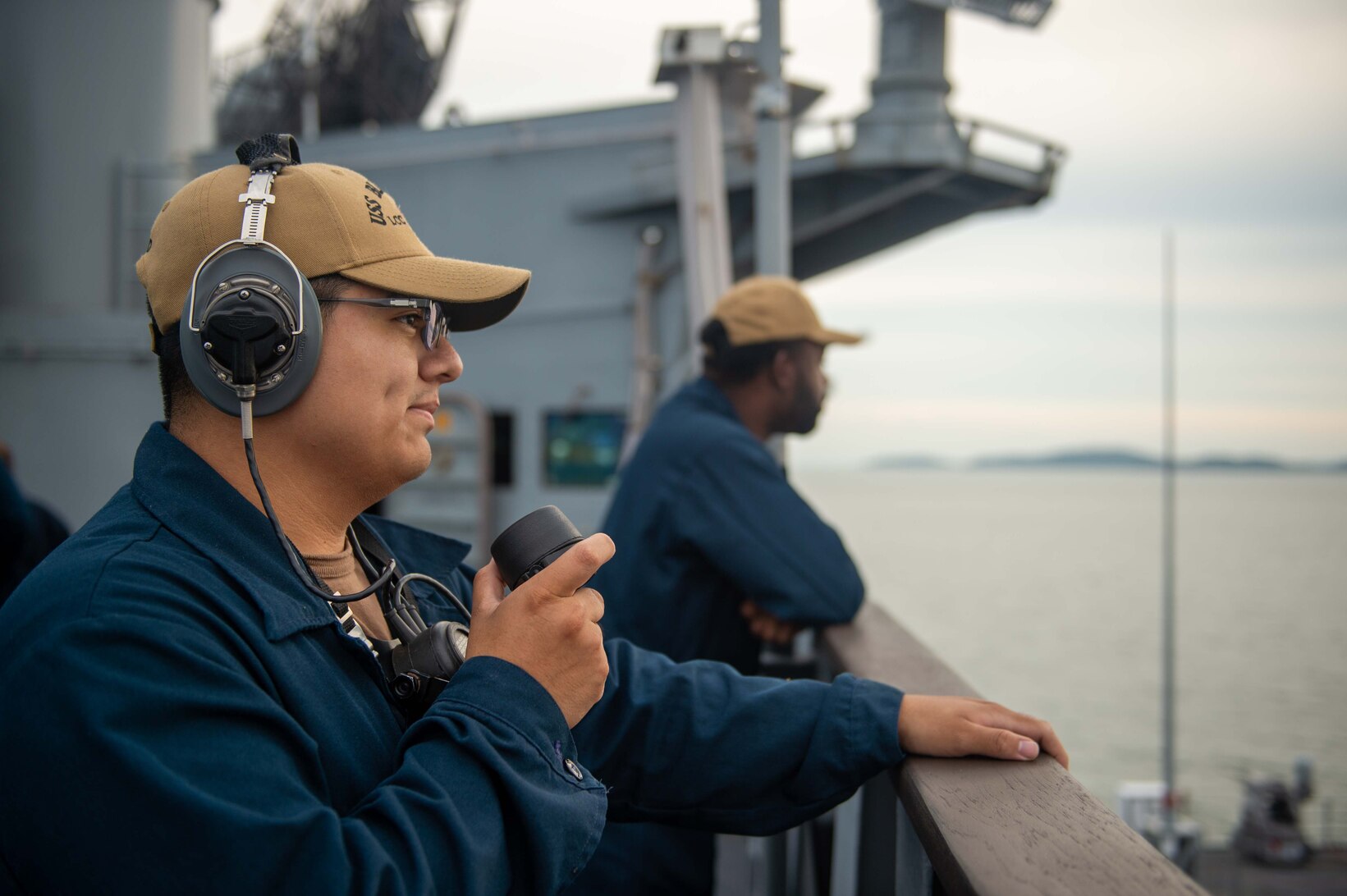 PYEONGTAEK, Republic of Korea (Sept. 18, 2025) – Operations Specialist Seaman Arturo Guerrero stands bridge wing lookout watch aboard U.S. 7th Fleet flagship USS Blue Ridge (LCC 19) while arriving in Pyeongtaek, Sept. 18. Blue Ridge and embarked U.S. 7th Fleet staff conduct regular Indo-Pacific patrols to deter aggression, strengthen alliances and partnerships, and advance future warfighting capabilities. (U.S. Navy photo by Mass Communication Specialist Seaman Andres Fonts)