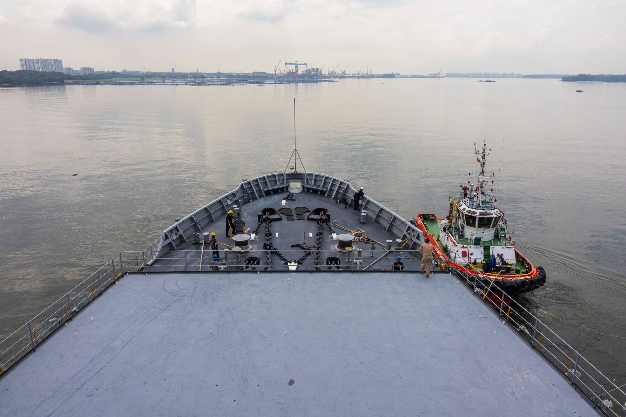 SINGAPORE (Sept. 11, 2025) – Forward-deployed submarine tender USS Frank Cable (AS 40) departs from Singapore after a scheduled port visit, Sept. 11. Frank Cable is underway supporting the U.S. 7th Fleet, the U.S. Navy’s largest forward-deployed numbered fleet, operating with allies and partners in preserving a free and open Indo-Pacific region. (U.S. Navy photo by Mass Communication Specialist Seaman Henry Sohl)