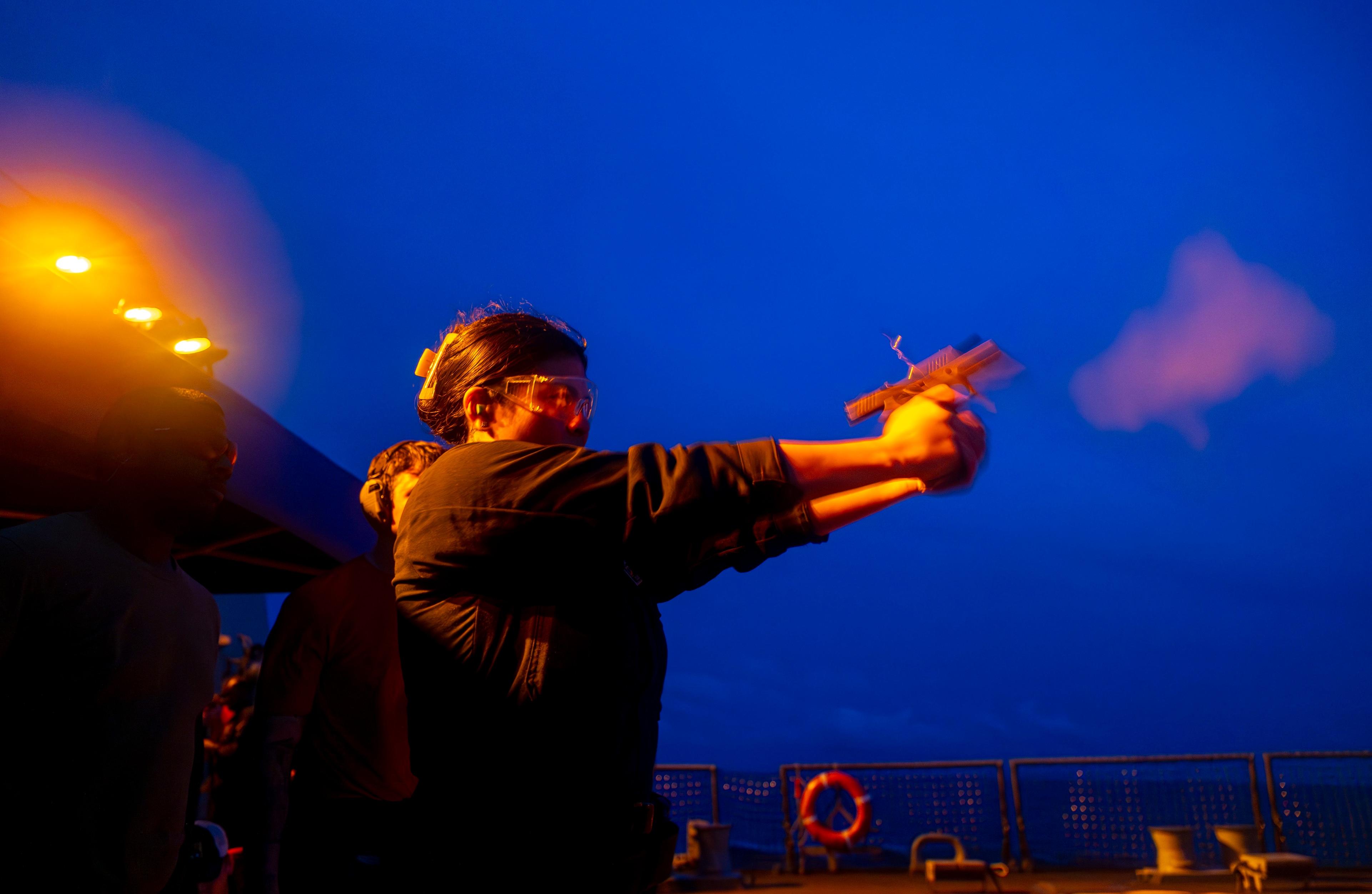 SOUTH CHINA SEA (Sept. 19, 2025) – Operations Specialist 3rd Class Danna Suarez shoots a 9mm pistol during a low-light small arms live-fire gunshoot aboard Arleigh Burke-class guided-missile destroyer USS Dewey (DDG 105) in the South China Sea, Sept. 19. Dewey is forward deployed and assigned to Destroyer Squadron (DESRON) 15, the Navy’s largest DESRON and the U.S. 7th Fleet’s principal surface force. (U.S. Navy photo by Mass Communication Specialist 2nd Class Oscar Diaz)