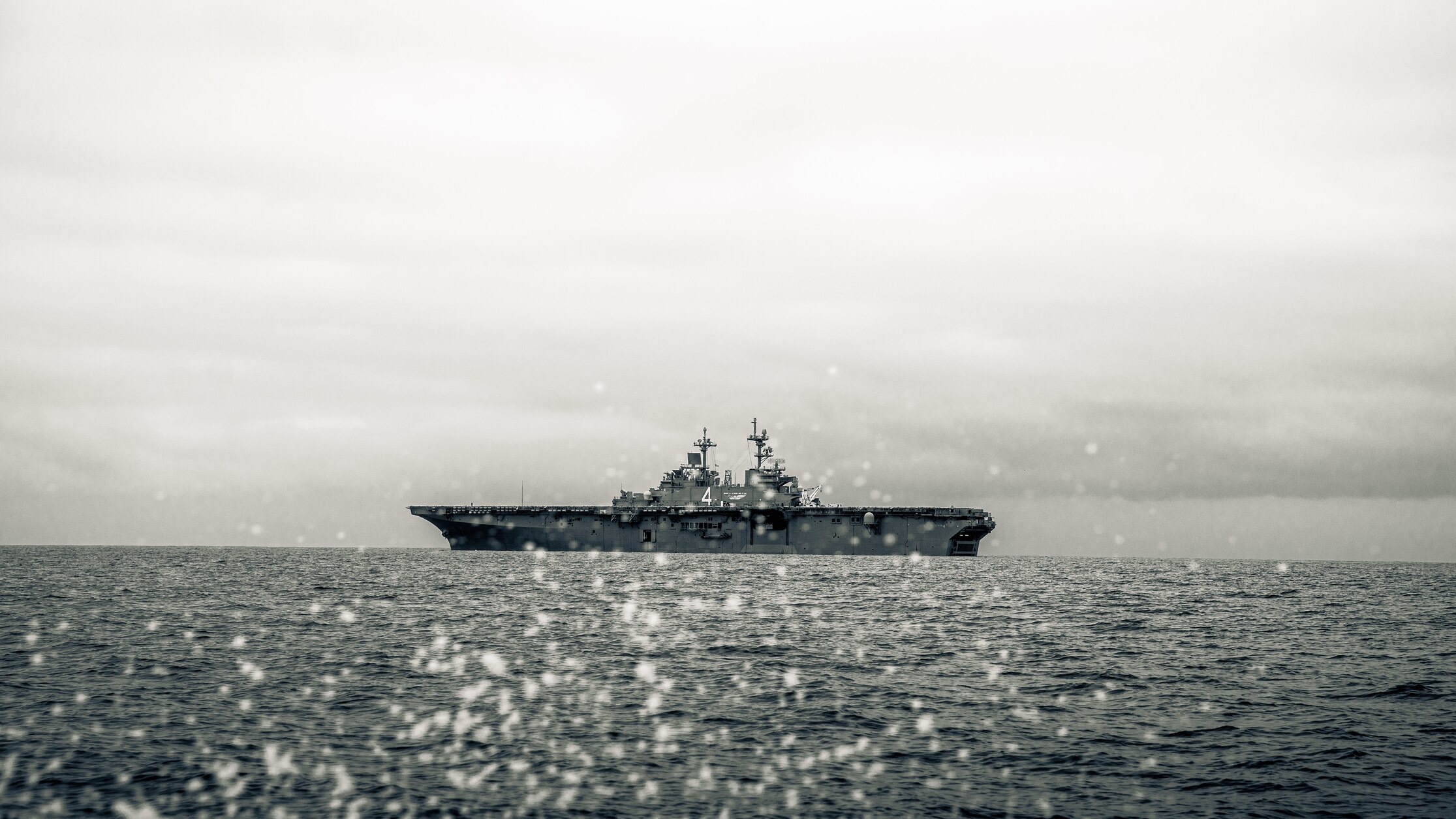 Amphibious assault ship USS Boxer (LHD 4) prepares to receive amphibious combat vehicles with Battalion Landing Team 3/5, 11th Marine Expeditionary Unit, I Marine Expeditionary Force, in the Pacific Ocean, Sept. 14, 2025. Elements of the 11th MEU embarked Boxer to conduct integrated training off the coast of Camp Pendleton, California. (U.S. Marine Corps photo by Cpl. Joseph Helms) (This image was created in color and changed to black-and-white.)
