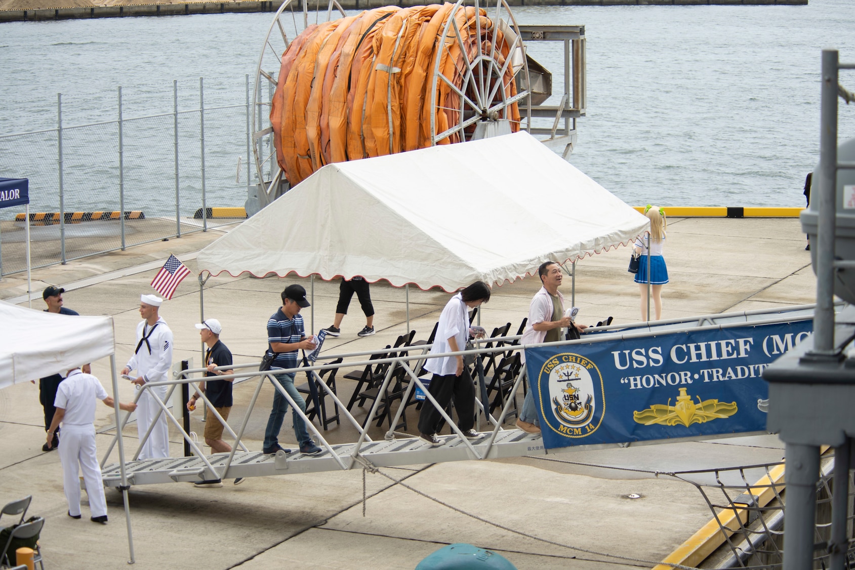 Sasebo community members board the Avenger-class mine countermeasures ship USS Chief (MCM 14) during the Japan Maritime Self-Defense Force (JMSDF) Sasebo Autumn Festival 2025 in Sasebo, Japan, Sept. 20, 2025. Chief welcomed more than 1,200 visitors during the festival which celebrated the 72nd anniversary of the founding of the JMSDF Sasebo District and included displays and demonstrations of JMSDF vessels, vehicles, equipment, and capabilities. (U.S. Navy photo by Mass Communication Specialist 2nd Class Raquell Williams)