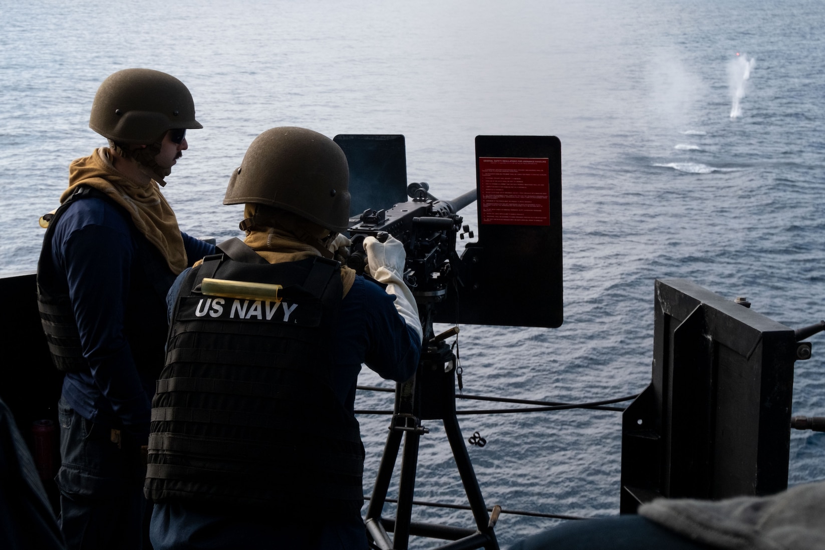 Aviation Ordnanceman Airman Isaiah Horn, right, assigned to Wasp-class amphibious assault ship USS Boxer (LHD 4), and a native of Fresno, California, shoots an M2A1 .50-caliber machine gun during a live-fire exercise, Sept. 6, 2025. Boxer is currently underway conducting routine operations in U.S. 3rd Fleet. (U.S. Navy photo by Mass Communication Specialist 3rd Class Normand Basque)