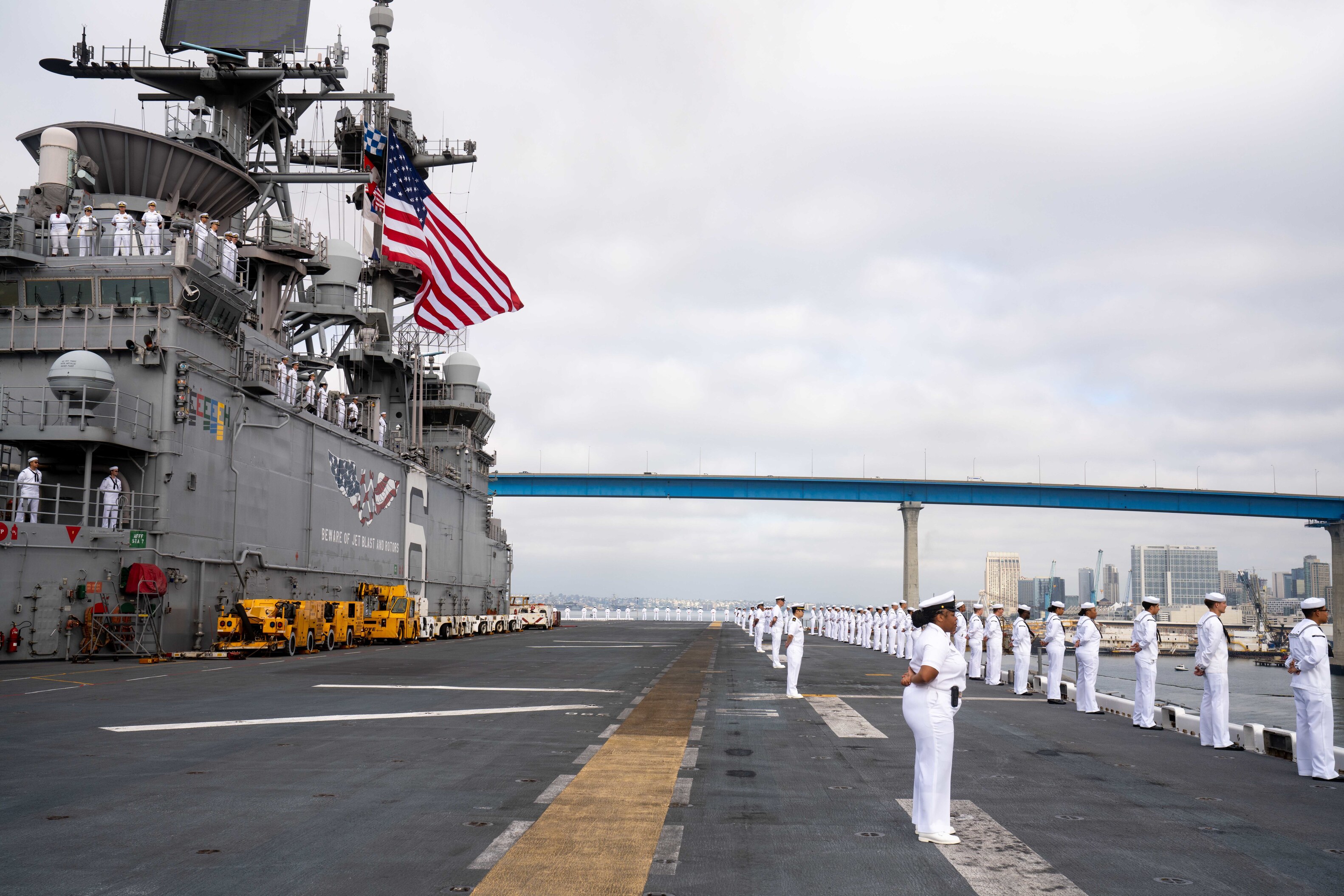 SAN DIEGO (Sept. 25, 2025) Amphibious assault ship USS America (LHA 6) transits San Diego Bay to its new homeport in San Diego, Sept. 25, marking the end of its six-year forward deployment to Sasebo, Japan, and the U.S. 7th Fleet area of operations. With a crew of over 1,200 Sailors and capable of deploying over 1,600 Marines, America delivers a self-contained, mobile crisis response force, ranging from combat operations to humanitarian aid and disaster response. (U.S. Navy photo by Mass Communication Specialist 1st Class Jomark A. Almazan)
