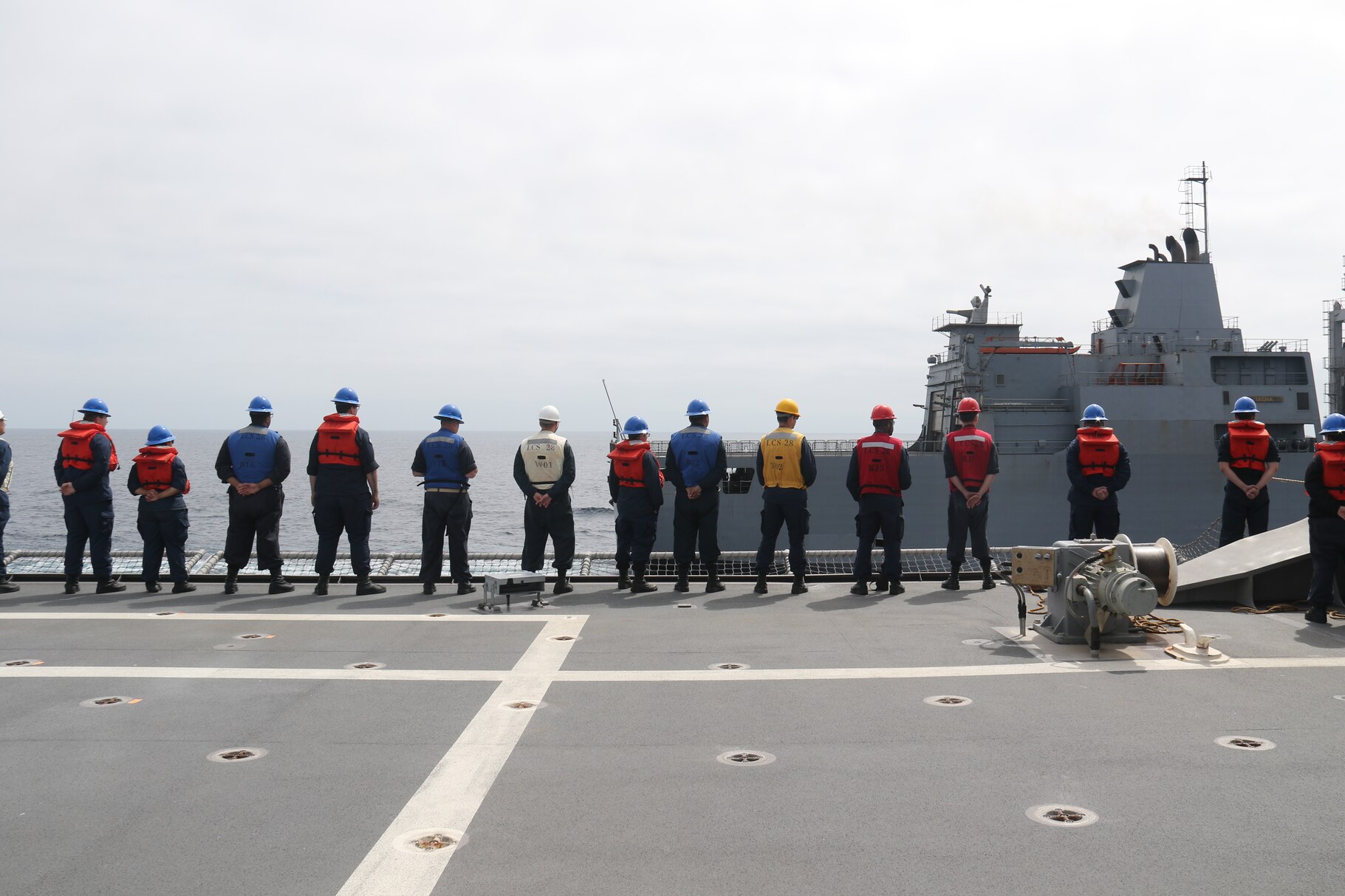 Sailors assigned to Independence-variant littoral combat ship USS Savannah (LCS 28) pull alongside Peruvian Navy Amsterdam-class support ship BAP Tacna (ARL-158) during a replenishment at sea, Sept. 14, 2025. Savannah is currently underway in the U.S. 3rd Fleet area of operations. An integral part of U.S. Pacific Fleet, U.S. 3rd Fleet operates naval forces in the Indo-Pacific and provides the realistic, relevant training necessary to execute the U.S. Navy’s role across the full spectrum of military operations. U.S. 3rd Fleet works together with our allies and partners to advance freedom of navigation, the rule of law, and other principles that underpin security for the Indo-Pacific region. (U.S. Navy photo by Mineman 3rd Class Petty Officer Angelo Rodriguez)