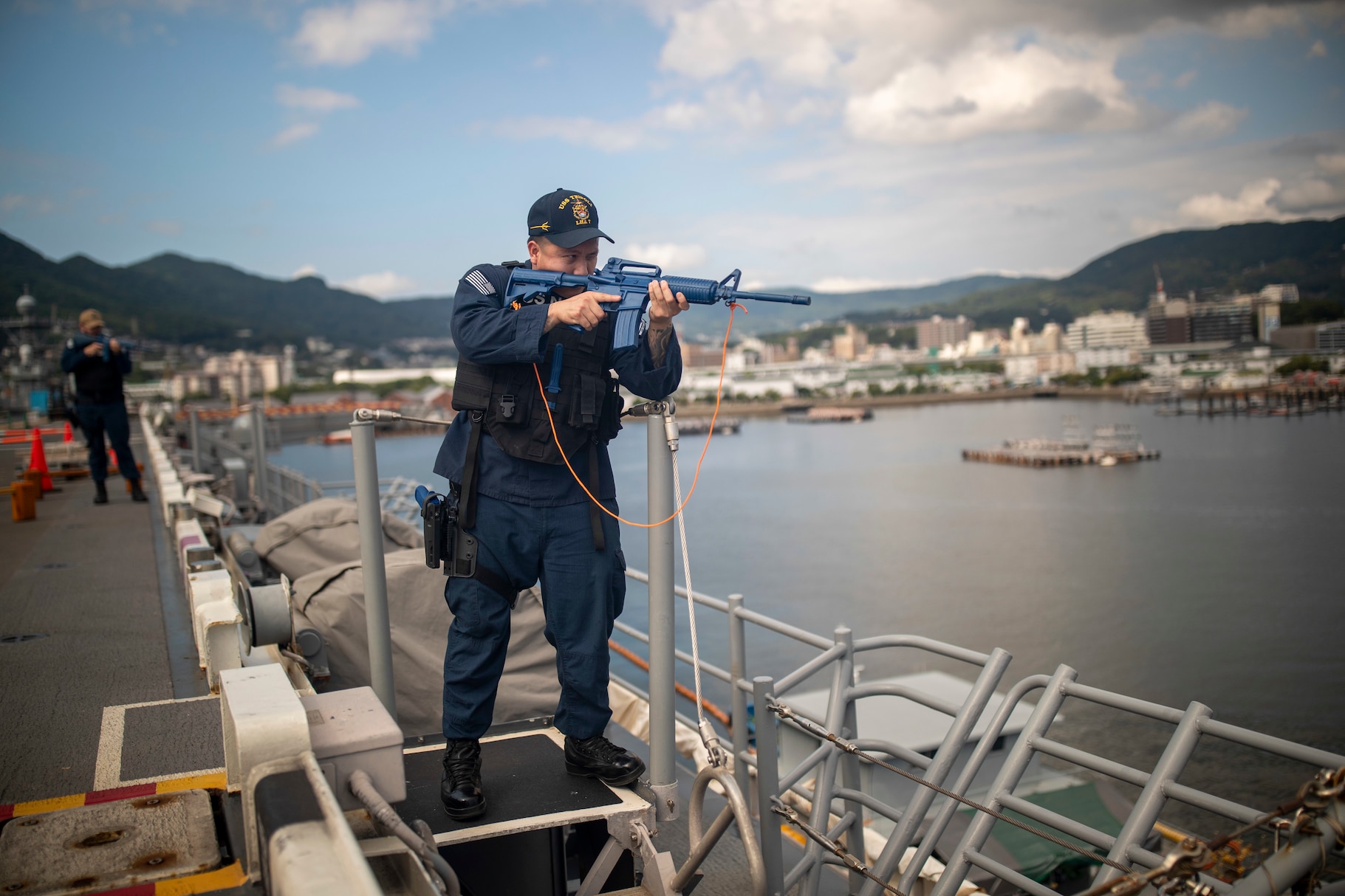 Aviation Boatswain’s Mate (Handling) 2nd Class Andrew Sampayan engages an attacking simulated water-craft during an anti-terrorism drill aboard amphibious assault carrier USS Tripoli (LHA 7), Sep. 22, 2025. Tripoli is forward deployed to Sasebo, Japan, and operates in U.S 7th Fleet, the U.S Navy’s largest forward-deployed numbered fleet, which routinely interacts and operates with allies and partners in preserving a free and open Indo-Pacific region. (U.S. Navy photo by Mass Communication Specialist Seaman Kobie Binette)