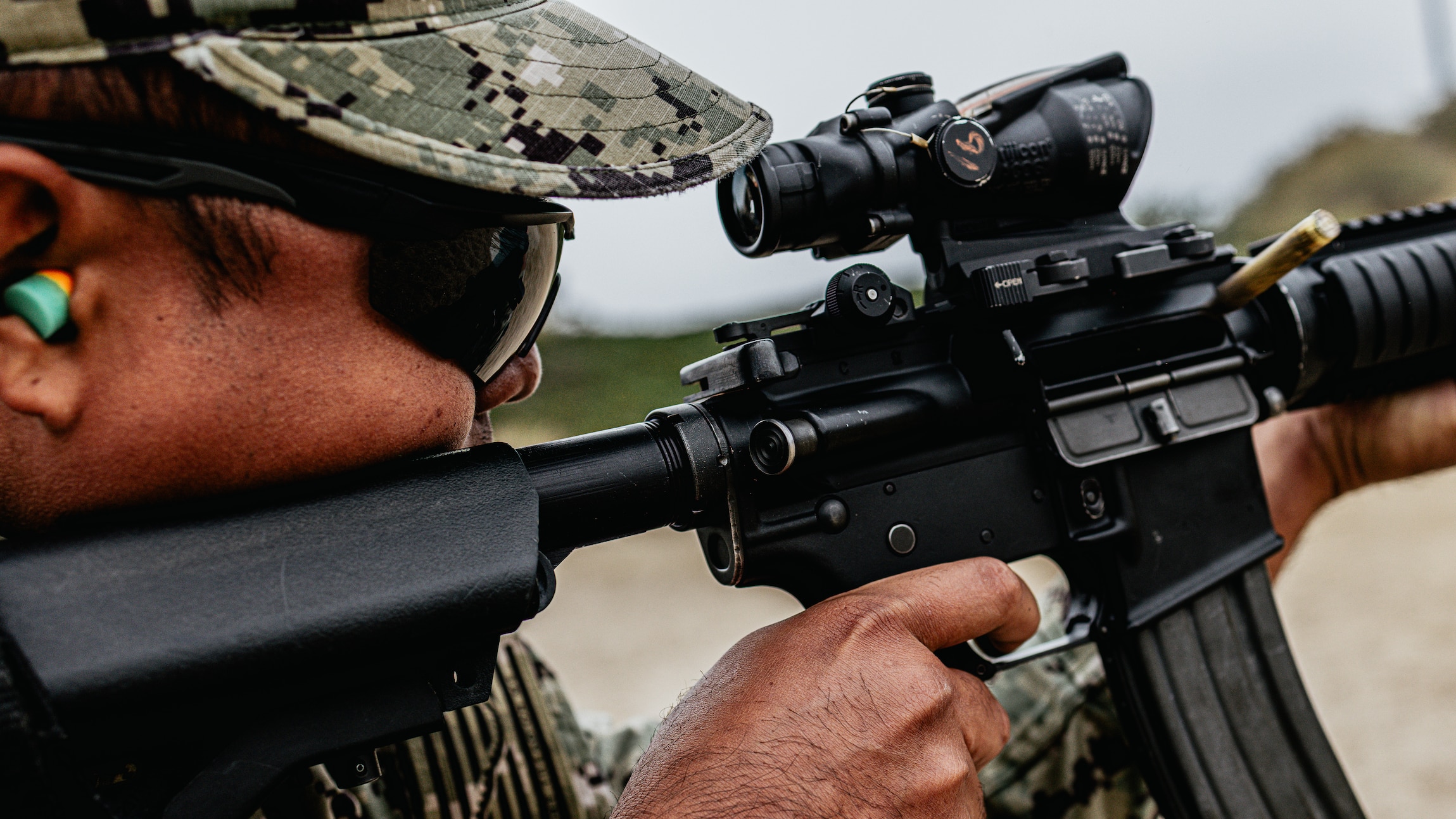 U.S. Navy Builder 3rd Class Michael Angelo-Rebamonte, a Seabee with Naval Mobile Construction Battalion (NMCB) 3, shoots the M-4 carbine at the Naval Base Ventura County Seabee Range in Ventura, California, Sept. 26, 2025. NMCB-3 is homeported in Port Hueneme, California, and is consistently training on high-quality construction, expeditionary logistics, and combat operations to support the U.S. and partner nations. (U.S. Navy photo by Mass Communication Specialist 2nd Class August Clawson)