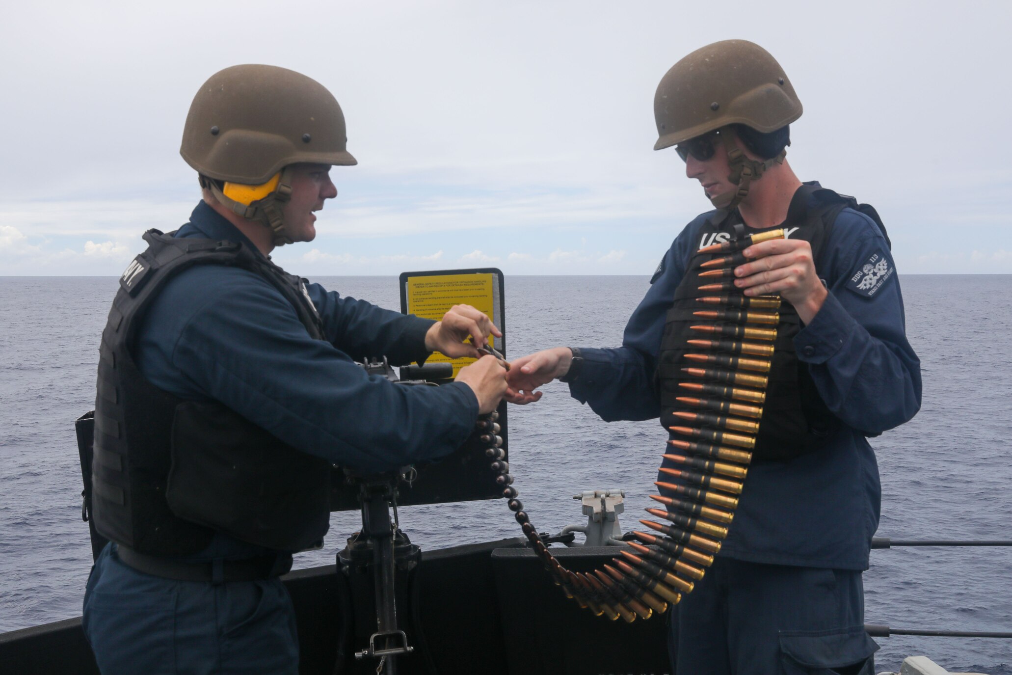 SOUTH CHINA SEA (Sep. 14, 2025) — Gunner’s Mate 3rd Class Trevor Cipriani, left, and Fire Controlman 3rd Class Ryan Beattie load ammo in a .50-caliber machine gun on the aft missile deck aboard Arleigh Burke-class guided-missile destroyer USS John Finn (DDG 113) during a gun shoot in the South China Sea, Sep. 14. John Finn is forward deployed and assigned to Destroyer Squadron (DESRON) 15, the Navy’s largest DESRON and the U.S. 7th Fleet’s principal surface force. (U.S. Navy photo by Mass Communication Specialist 2nd Class Alexandria Esteban)