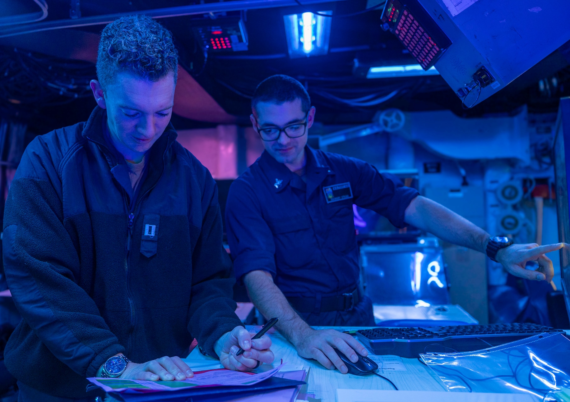 TOKYO BAY, Japan (Sept. 7, 2025) – Lt. Michael Tortorich, left, and Operations Specialist 1st Class Zachary Strong prepare for a combat systems training team exercise in the combat information center aboard Arleigh Burke-class guided-missile destroyer USS Dewey (DDG 105), Sept. 7. Dewey is forward deployed and assigned to Destroyer Squadron (DESRON) 15, the Navy’s largest DESRON and the U.S. 7th Fleet’s principal surface force. (U.S. Navy photo by Mass Communication Specialist 2nd Class Oscar Diaz)