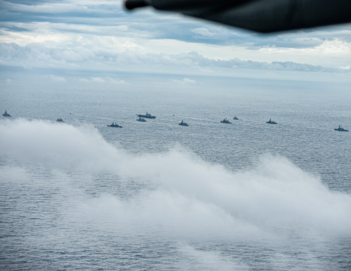 PHILIPPINE SEA (Oct. 20, 2025) - Japan Maritime Self-Defense Force and U.S. Navy forces with Royal Australian Navy, Royal Canadian Navy, and French Navy sail together in the Philippine Sea, Oct. 20, 2025 in support of Annual Exercise (ANNUALEX) 25. ANNUALEX is a multilateral exercise that enhances the Japan and U.S. alliance, strengthens naval interoperability and demonstrates a joint commitment to a free and open Indo-Pacific. (U.S. Navy photo by Petty Officer 1st Class R. Ezekiel Duran)