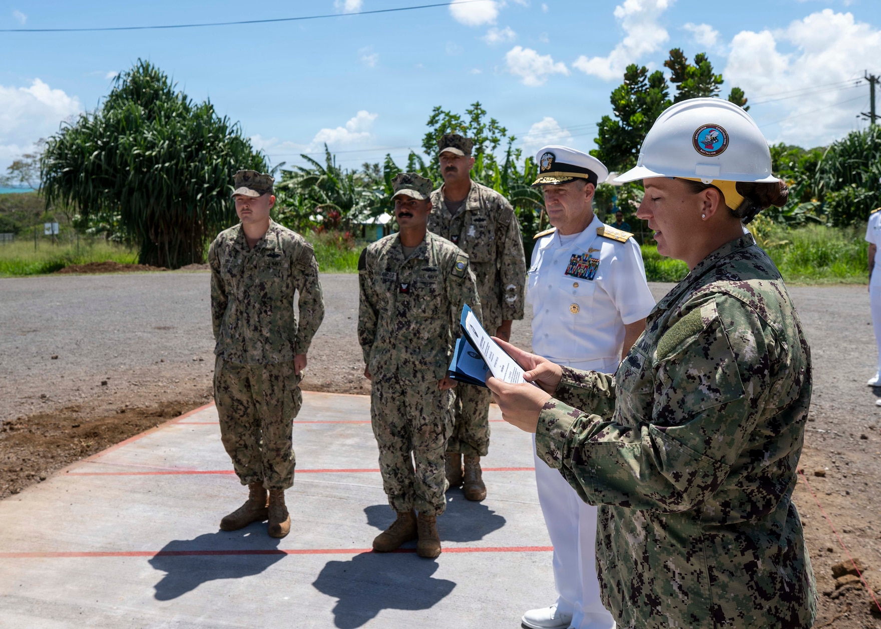 Chief Steelworker Shianne Chlupacek, assigned to Navy Mobile Construction Battalion 4, right, reads a frocking letter during a frocking ceremony at the Faleolo District Hospital, during a tour of Pacific Partnership 2025 projects, in Apia, Samoa, Oct. 31, 2025. Now in its 21st iteration, the Pacific Partnership series is the largest annual multinational humanitarian assistance and disaster management preparedness mission conducted in the Indo-Pacific which fosters relationships, strengthens regional stability, and increases readiness to respond to crises. The visit to Samoa underscored Koehler’s commitment to the Pacific Islands in addressing our shared maritime challenges to promote a free, open, and secure Indo-Pacific. (U.S. Navy photo by Mass Communication Specialist 2nd Class Christopher Aric Sypert)