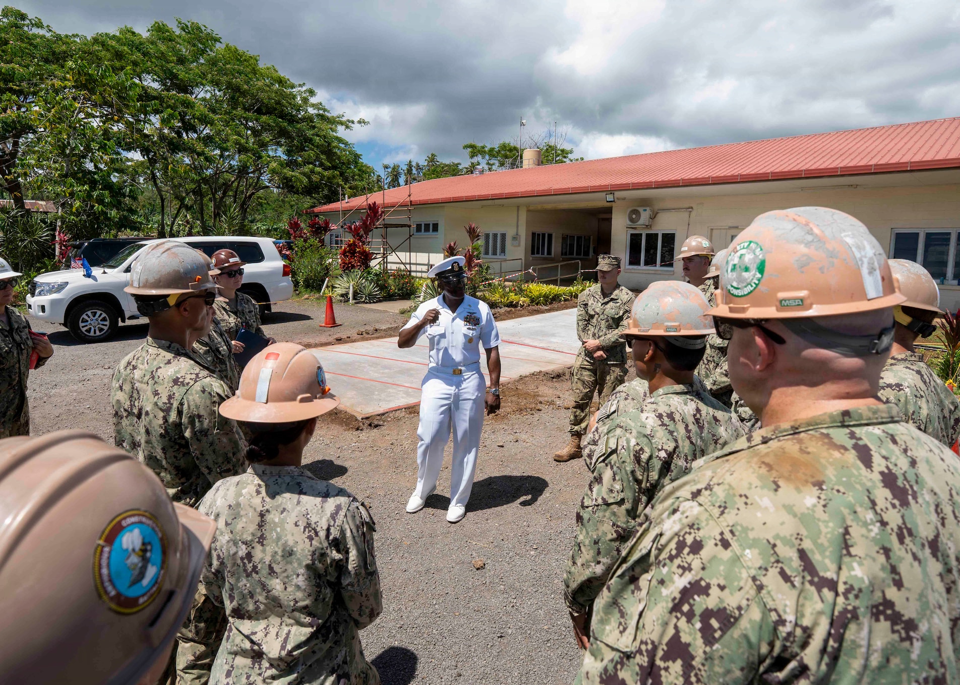 U.S. Pacific Fleet Master Chief Don Davis, center, thanks Sailors assigned to Navy Mobile Construction Battalion 4 for their work in support of Pacific Partnership 2025 at the Faleolo District Hospital, during a tour of Pacific Partnership 2025 projects, in Apia, Samoa, Oct. 31, 2025. Now in its 21st iteration, the Pacific Partnership series is the largest annual multinational humanitarian assistance and disaster management preparedness mission conducted in the Indo-Pacific which fosters relationships, strengthens regional stability, and increases readiness to respond to crises. The visit to Samoa underscored the U.S. commitment to the Pacific Islands in addressing our shared maritime challenges to promote a free, open, and secure Indo-Pacific. (U.S. Navy photo by Mass Communication Specialist 2nd Class Christopher Aric Sypert)