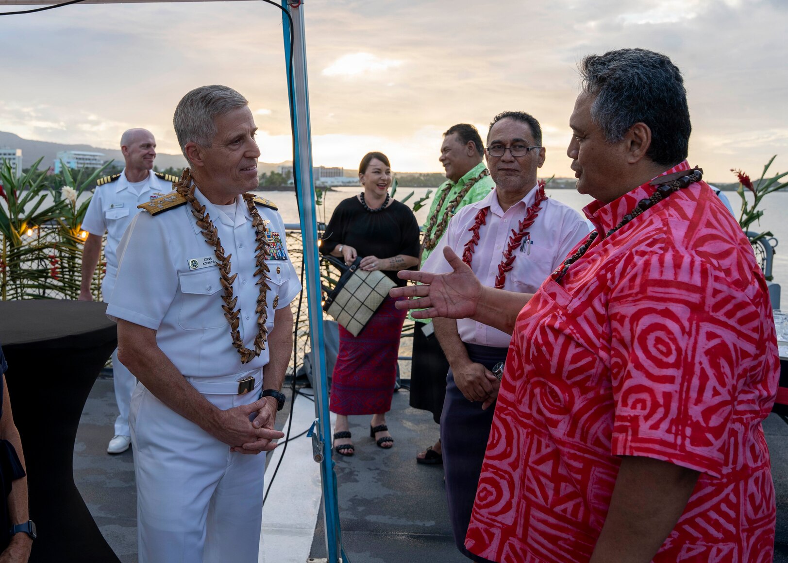 Adm. Steve Koehler, commander, U.S. Pacific Fleet, left, speaks to Toelupe Poumulinuku Onesemo, deputy prime minister of Samoa, during the Pacific Partnership 2025 closing ceremony aboard the French Navy’s oversea patrol vessel Auguste Bénébig, in Apia, Samoa, Oct. 31, 2025. Now in its 21st iteration, the Pacific Partnership series is the largest annual multinational humanitarian assistance and disaster management preparedness mission conducted in the Indo-Pacific which fosters relationships, strengthens regional stability, and increases readiness to respond to crises. The visit to Samoa underscored Koehler’s commitment to the Pacific Islands in addressing our shared maritime challenges to promote a free, open, and secure Indo-Pacific. (U.S. Navy photo by Mass Communication Specialist 2nd Class Christopher Aric Sypert)