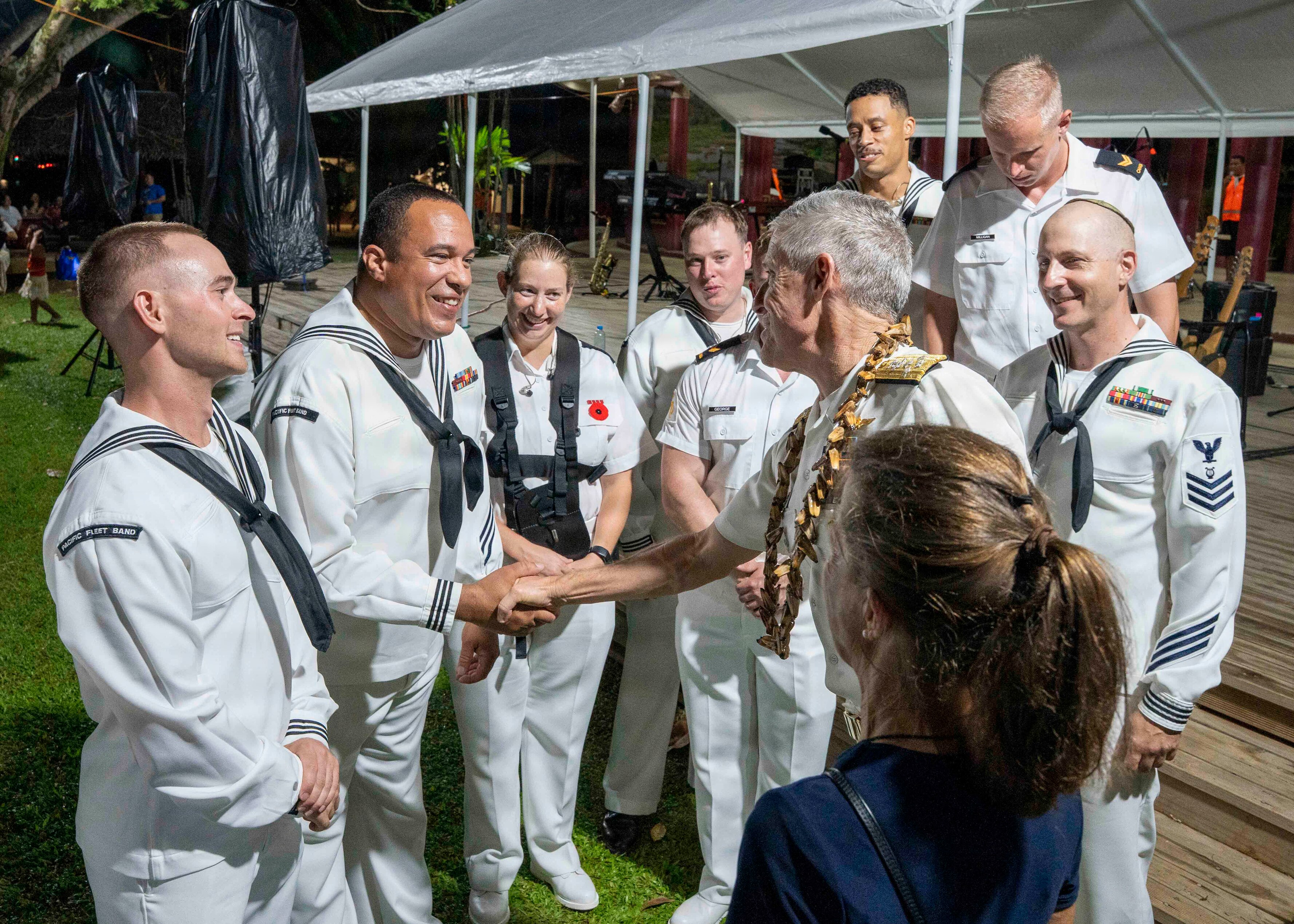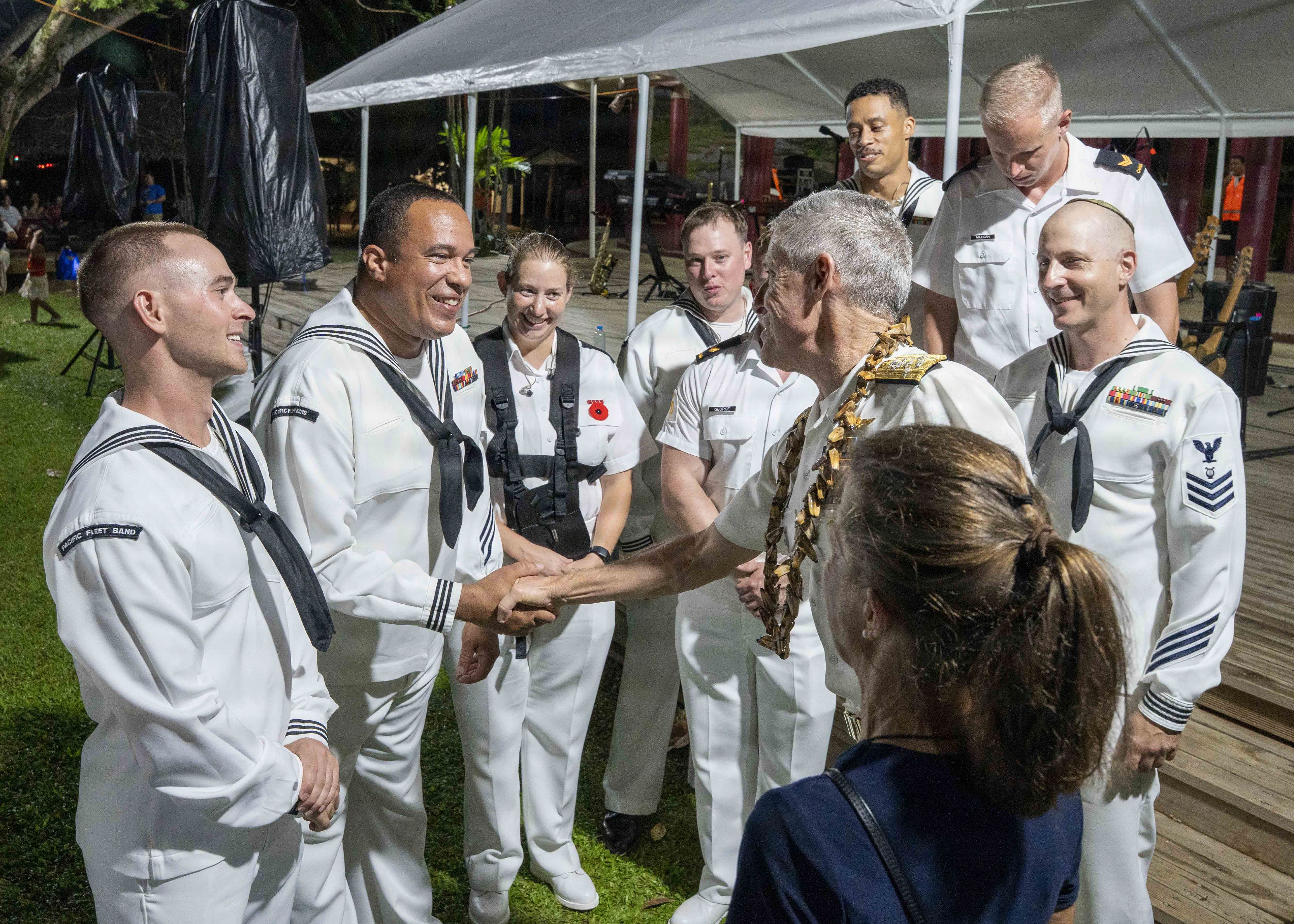 Adm. Steve Koehler, commander, U.S. Pacific Fleet, center right, and his wife, Gina Koehler, foreground, greet Sailors prior to a Pacific Partnership 2025 band performance in Apia, Samoa, Oct. 31, 2025. Now in its 21st iteration, the Pacific Partnership series is the largest annual multinational humanitarian assistance and disaster management preparedness mission conducted in the Indo-Pacific which fosters relationships, strengthens regional stability, and increases readiness to respond to crises. The visit to Samoa underscored Koehler’s commitment to the Pacific Islands in addressing our shared maritime challenges to promote a free, open, and secure Indo-Pacific. (U.S. Navy photo by Mass Communication Specialist Christopher Aric Sypert)