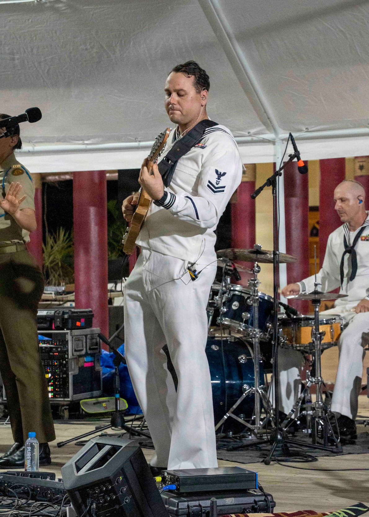 Musician 2nd Class Marshall Wacker, U.S. Pacific Fleet Band, performs at a night market with the Pacific Partnership 2025 band in Apia, Samoa, Oct. 31, 2025. Now in its 21st iteration, the Pacific Partnership series is the largest annual multinational humanitarian assistance and disaster management preparedness mission conducted in the Indo-Pacific which fosters relationships, strengthens regional stability, and increases readiness to respond to crises. The visit to Samoa underscored Koehler’s commitment to the Pacific Islands in addressing our shared maritime challenges to promote a free, open, and secure Indo-Pacific. (U.S. Navy photo by Mass Communication Specialist Christopher Aric Sypert)