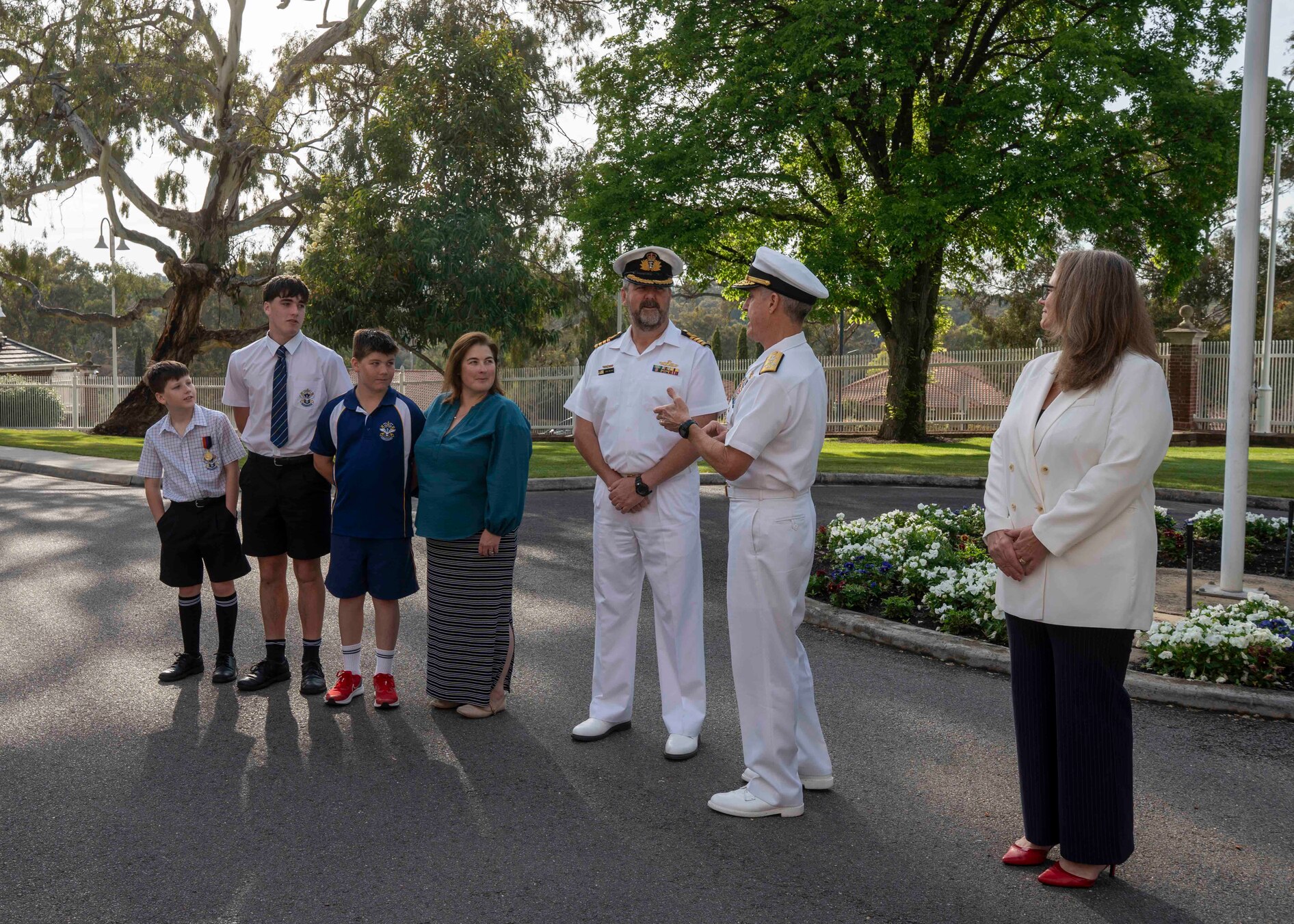 Adm. Steve Koehler, commander, U.S. Pacific Fleet (COMPACFLT), center right, thanks Capt. Josh Wilson, Royal Australian Navy, and his family for their service during a Legion of Merit presentation ceremony at the U.S. Embassy in Canberra, Australia, Nov. 3, 2025. Wilson was presented the Legion of Merit for his service as the deputy director of COMPACTLT’s N51 directorate. The U.S.- Australia alliance remains a cornerstone for peace and prosperity in the Indo-Pacific. The visit to Australia further deepened the strong relationship and advanced both countries’ shared interest in maintaining freedom of navigation, overflight, and other lawful uses of the sea. (U.S. Navy photo by Mass Communication Specialist 2nd Class Christopher Sypert)