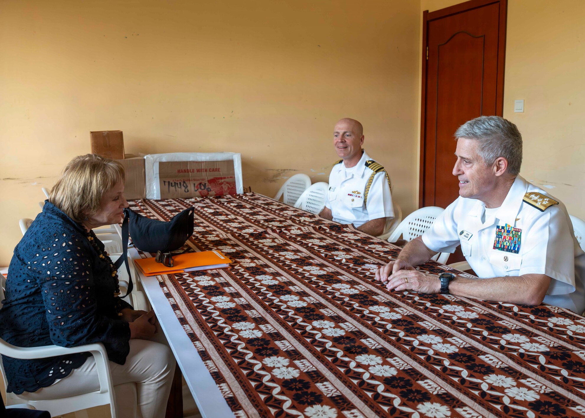 Adm. Steve Koehler, commander, U.S. Pacific Fleet, right, meets with the U.S. Ambassador to Papua New Guinea, Solomon Islands, and Vanuatu, Ann Marie Yastishock, left, in Luganville, Vanuatu, Nov. 7, 2025. The visit to Vanuatu underscored Koehler’s commitment to the Pacific Islands in addressing our shared maritime challenges to promote a free, open, and secure Indo-Pacific. (U.S. Navy photo by Mass Communication Specialist 2nd Class Christopher Aric Sypert)