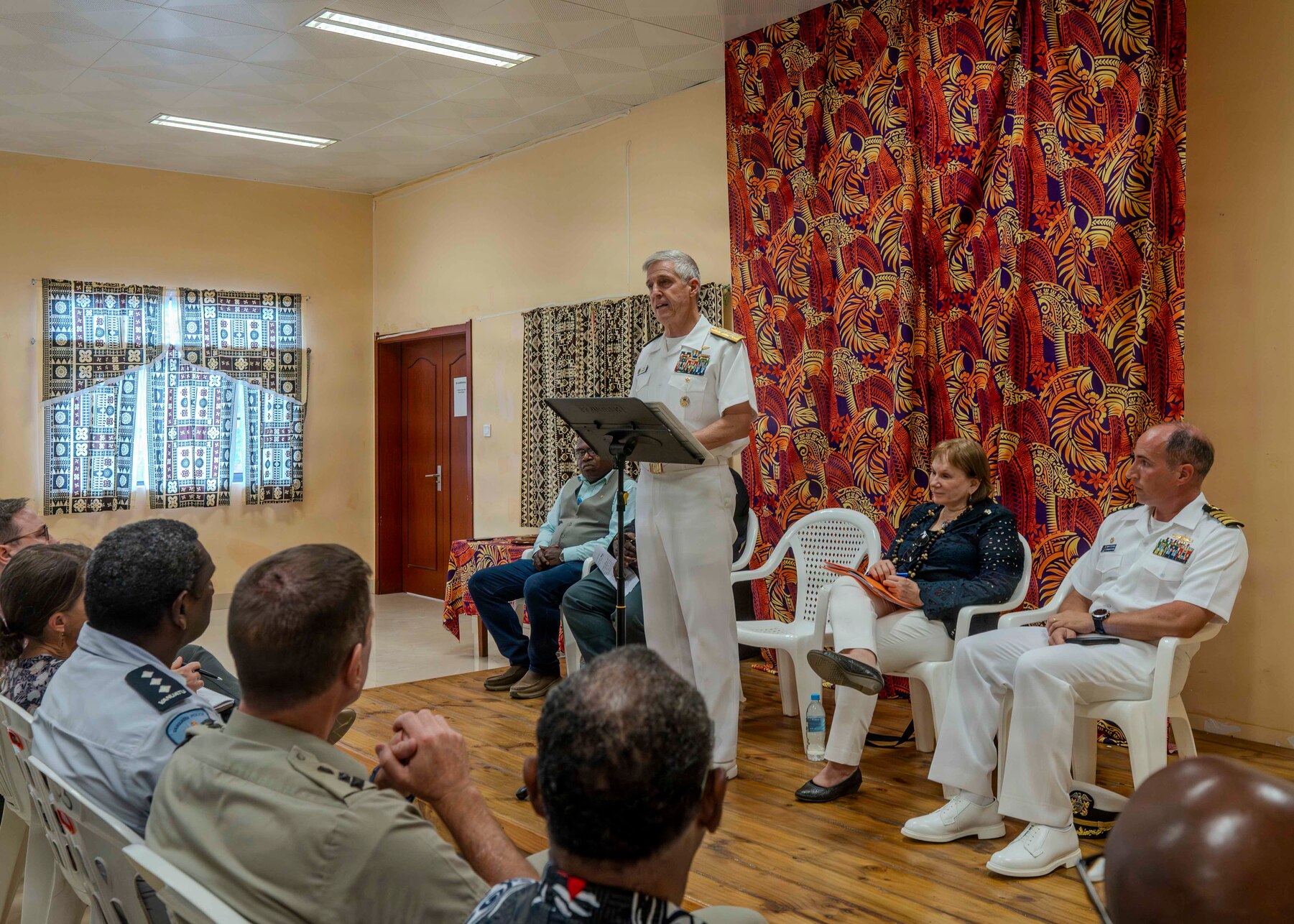 Adm. Steve Koehler, commander, U.S. Pacific Fleet, center, delivers remarks at the Pacific Partnership 2025 opening ceremony in Luganville, Vanuatu, Nov. 7, 2025. Now in its 21st iteration, the Pacific Partnership series is the largest annual multinational humanitarian assistance and disaster management preparedness mission conducted in the Indo-Pacific. The visit to Vanuatu underscored Koehler’s commitment to the Pacific Islands in addressing our shared maritime challenges to promote a free, open, and secure Indo-Pacific. (U.S. Navy photo by Mass Communication Specialist 2nd Class Christopher Aric Sypert)