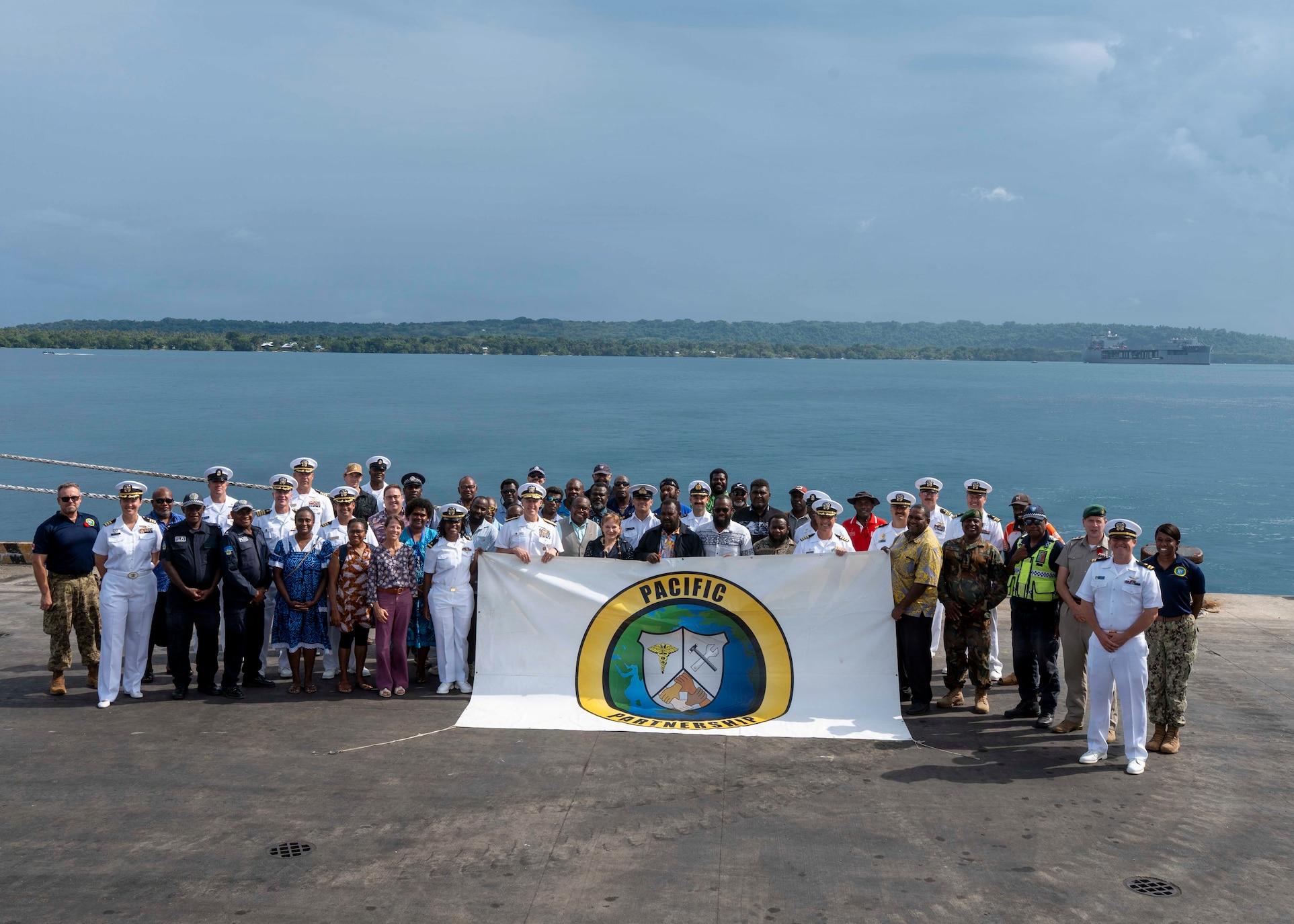 Adm. Steve Koehler, commander, U.S. Pacific Fleet, U.S. Ambassador to Papua New Guinea, Solomon Islands, and Vanuatu, Ann Marie Yastishock, Sanma Province President Bridley Livo, Sanma Province Secretary General Jonathan Iavere, and Pacific Partnership 2025 (PP25) leadership, pose for a photo following the PP25 opening ceremony in Luganville, Vanuatu, Nov. 7, 2025. Now in its 21st iteration, the Pacific Partnership series is the largest annual multinational humanitarian assistance and disaster management preparedness mission conducted in the Indo-Pacific. The visit to Vanuatu underscored Koehler’s commitment to the Pacific Islands in addressing our shared maritime challenges to promote a free, open, and secure Indo-Pacific. (U.S. Navy photo by Mass Communication Specialist 2nd Class Christopher Aric Sypert)