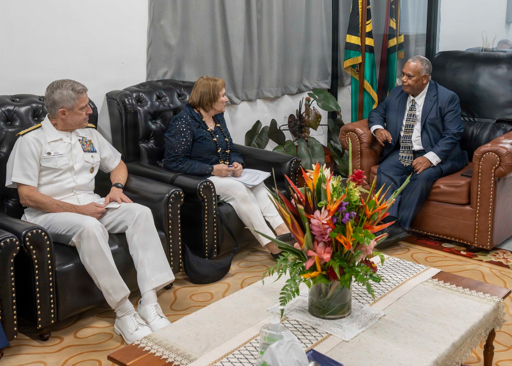 Adm. Steve Koehler, commander, U.S. Pacific Fleet, left, and U.S. Ambassador to Papua New Guinea, Solomon Islands, and Vanuatu, Ann Marie Yastishock, center, meet with Jotham Napat, prime minister of Vanuatu, in Port Vila, Vanuatu, Nov. 7, 2025. The visit to Vanuatu underscored Koehler’s commitment to the Pacific Islands in addressing our shared maritime challenges to promote a free, open, and secure Indo-Pacific. (U.S. Navy photo by Mass Communication Specialist 2nd Class Christopher Aric Sypert)