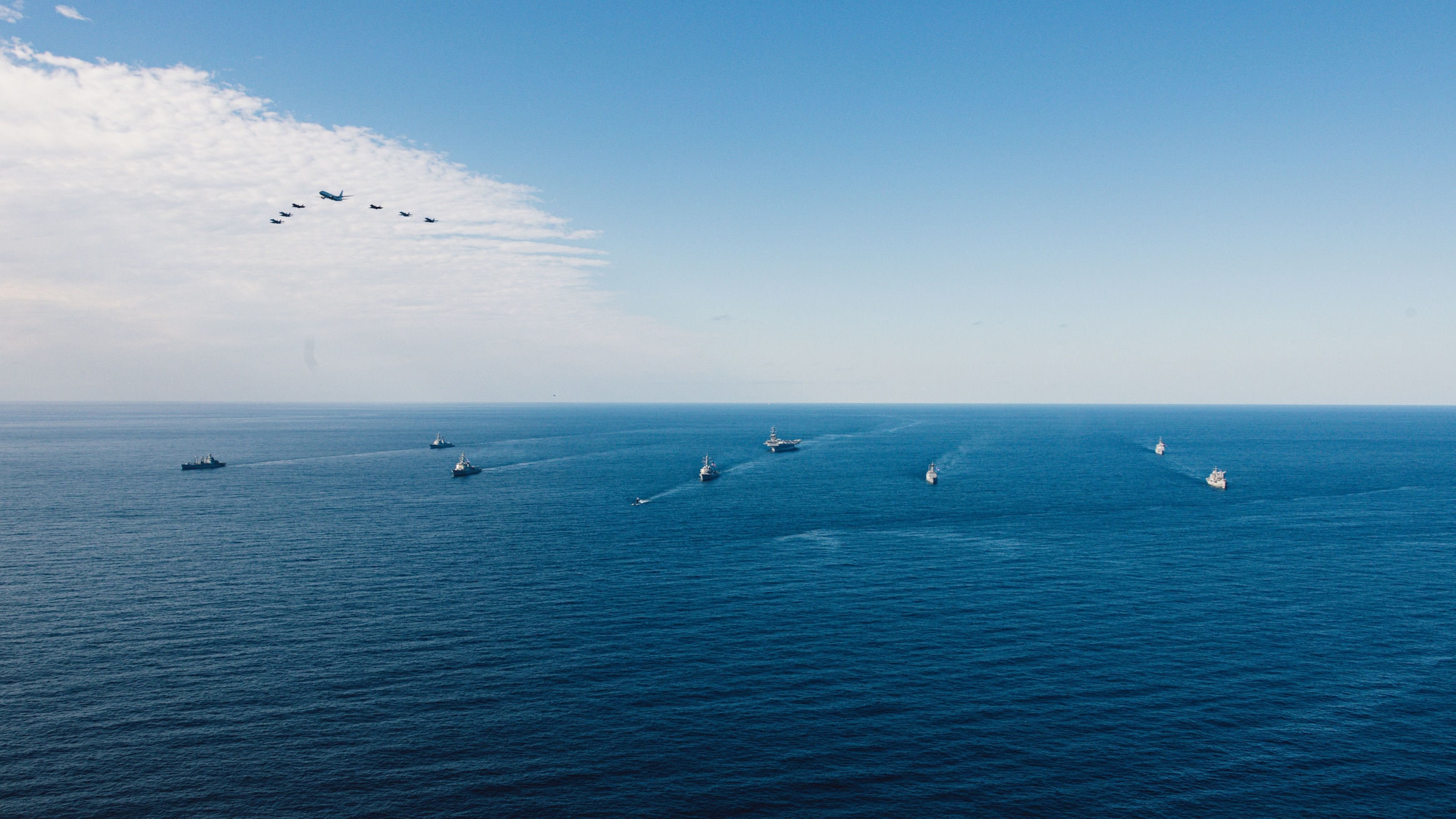 Forces from the U.S. Navy George Washington Carrier Strike Group, Carrier Airwing (CVW) 5, and Republic of Korea Navy sail and fly in formation during Carrier Strike Group Exercise (CSGEX) while at sea, Nov. 12, 2025. CSGEX is a bilateral exercise that strengthens naval interoperability, enhances the U.S. and Republic of Korea alliance, and demonstrates joint commitment to a free and open Indo-Pacific. USS George Washington (CVN 73) is the U.S. Navy’s premier forward-deployed aircraft carrier, a long-standing symbol of the United States’ commitment to maintaining a free and open Indo-Pacific region, while operating alongside allies and partners across the U.S. Navy’s largest numbered fleet. (U.S. Navy photo by Mass Communication Specialist 2nd Class Geoffrey L. Ottinger)